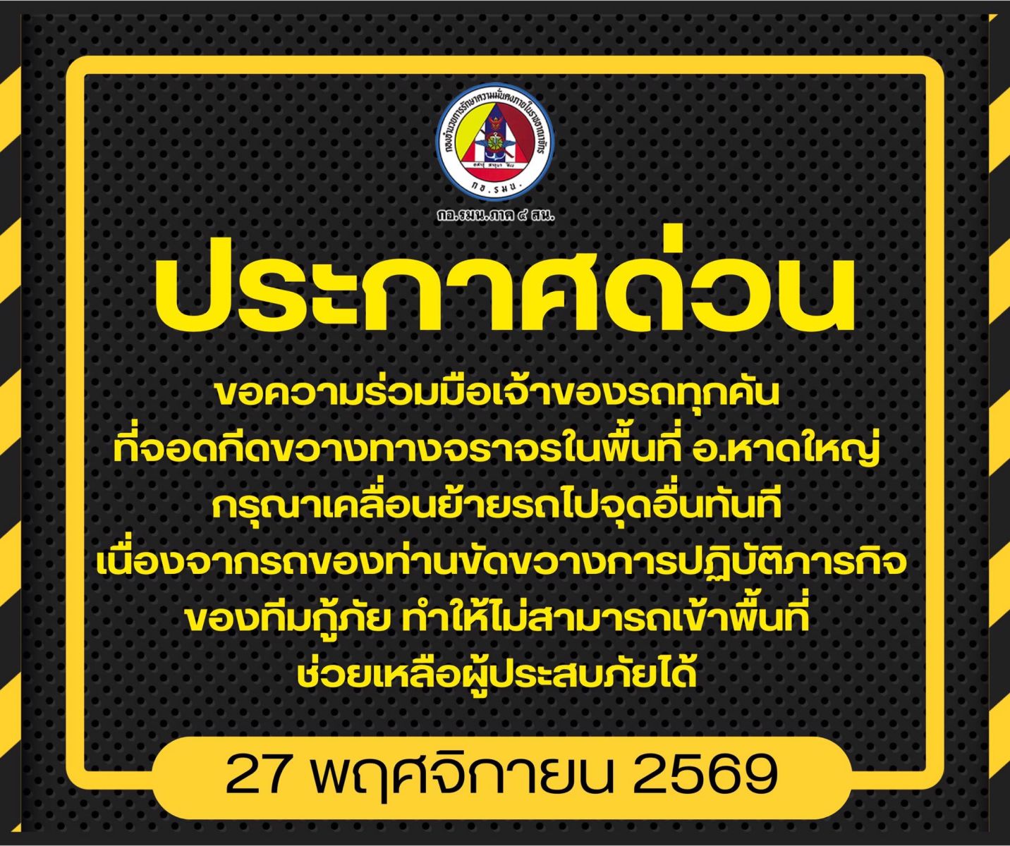 กองอำนวยการรักษาความมั่นคงภายในภาค 4 ส่วนหน้า ประกาศด่วน! โปรดเคลื่อนย้ายรถยนต์ออกจากเส้นทาง และจุดที่กีดขวางการจราจร