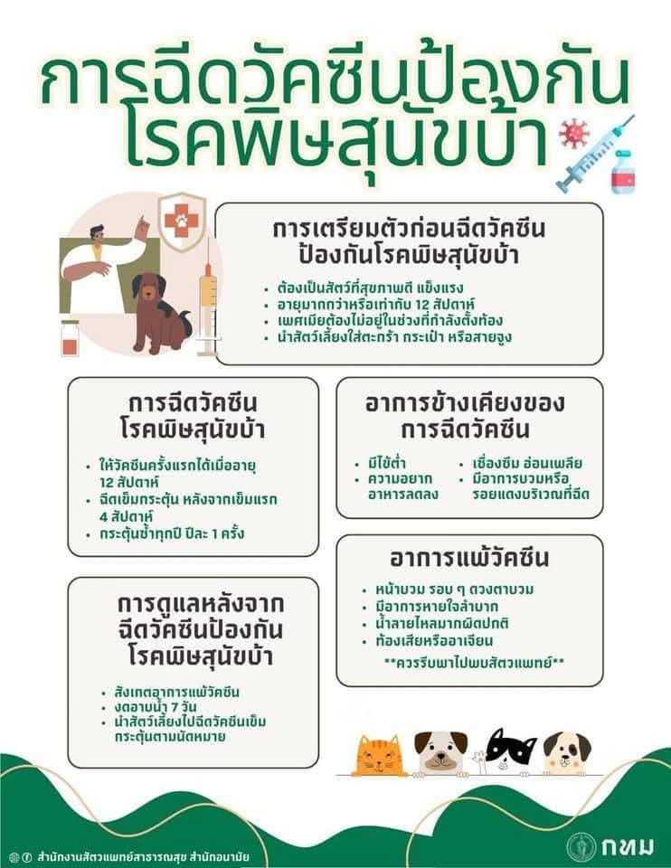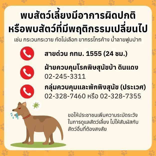 หากพบสุนัขหรือแมวที่เสียชีวิตหรือมีอาการเข้าข่ายต้องสงสัยโรคพิษสุนัขบ้า (กระวนกระวาย ไม่อยู่นิ่ง กัดทุกอย่างที่ขวางหน้า ตัวแข็ง น้ำลายไหล ลิ้นห้อย)