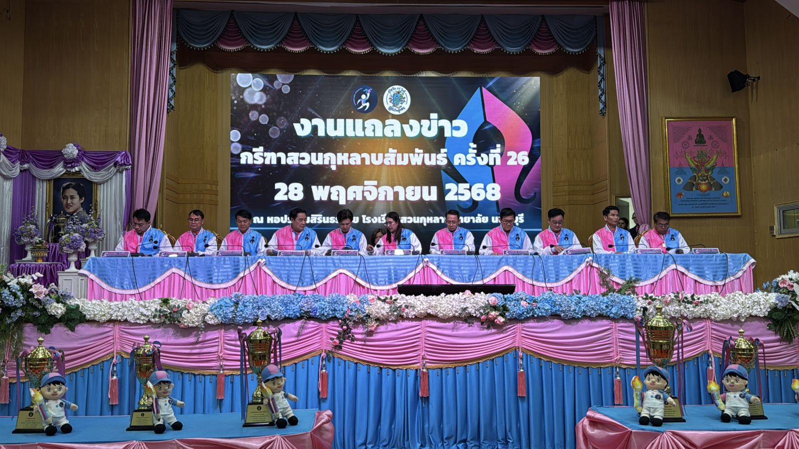 เมื่อเวลา 14.30 น.วันที่ 28 พ.ย.68 ที่หอประชุมสิรินธราลัย โรงเรียนสวนกุหลาบวิทยาลัยนนทบุรี ถนนติวานนท์ ต.ปากเกร็ด อ.ปากเกร็ด จ.นนทบุรี นางจรูญ จารุสาร ผอ.รร.สวนกุหลาบวิทยาลัยนนทบุรี เจ้าภาพการจัดการแข่งขัน และผู้อำนวยการโรงเรียนสวนกุหลาบวิทยาลัยจำนวน 10 สวน ร่วมกันแถลงข่าวการจัดการแข่งขันกรีฑาสวนกุหลาบสัมพันธ์ 11 สวน ครั้งที่ 26 ในระหว่างวันที่ 11-12 ธ.ค. 68 ที่สนามกีฬากลาง อ.เมือง จ.นนทบุรี ภายใต้แนวคิด “ 11 สวนกุหลาบ คุณค่าอันหลากหลาย ที่มีมุ่งหมายเดียวกัน”