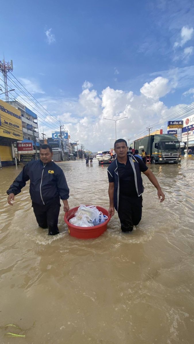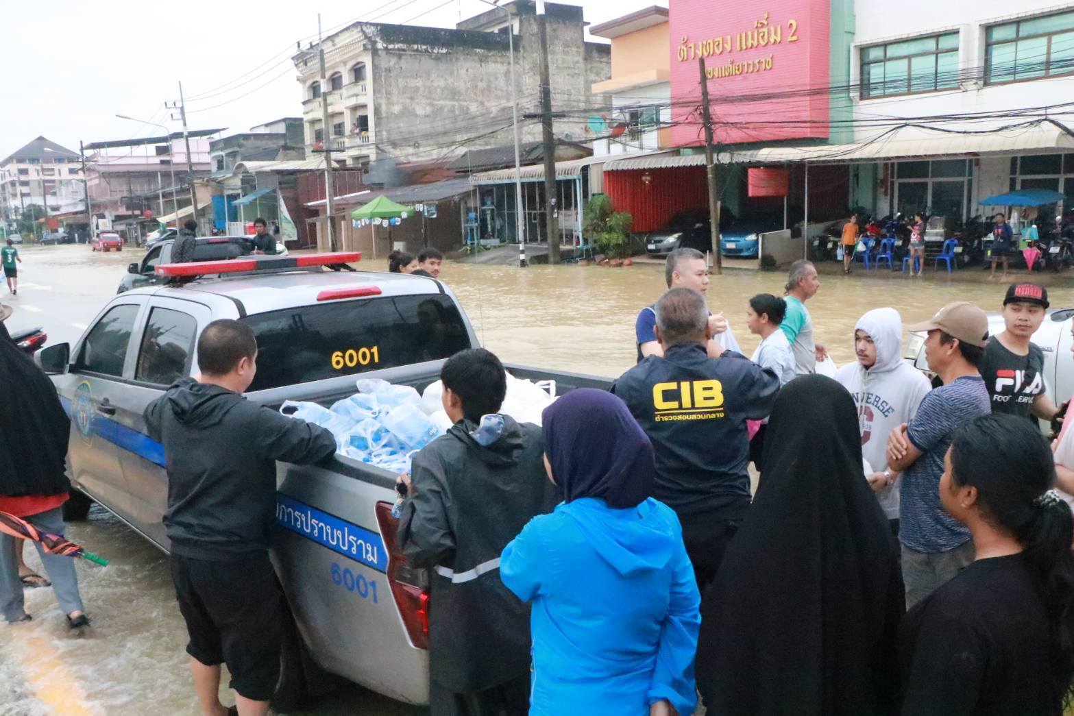 นอกจากนี้ยังช่วยเหลือเร่งด่วนในพื้นที่ จ.นราธิวาส เรื่องจากเส้นทางถูกตัดขาดและขาดแคลนอาหาร โดยเฉพาะครอบครัวที่มีเด็กเล็ก กำลังพลจึงจัดส่งสิ่งของถึงพื้นที่ทันที โดยได้มอบสิ่งของบรรเทาทุกข์ ข้าวกล่อง น้ำดื่ม ให้ชาวบ้านผู้ประสบภัยน้ำท่วมในพื้นที่ ต.มะนังตายอ อ.เมืองนราธิวาส จ.นราธิวาส เป็นข้าวกล่อง จำนวน 300 ชุด น้ำดื่ม 600 ขวด และให้ชาวบ้านผู้ประสบภัยน้ำท่วมในพื้นที่ ศูนย์พักพิง รร.เทศบาล 4 อ.เมืองนราธิวาส จ.นราธิวาส เป็นข้าวกล่อง จำนวน 200 ชุด น้ำดื่ม 600 ขวด และเริ่มจัดตั้งโรงครัวกองปราบปราม จ.สงขลา จัดตั้ง “โรงครัวกองปราบปราม” ณ ป้อมท่าช้าง อ.บางกล่ำ เพื่อประกอบอาหารและกระจายไปยังพื้นที่เสี่ยง อ.หาดใหญ่ และ อ.บางกล่ำ จ.สงขลา โดยได้มอบสิ่งของบรรเทาทุกข์ ข้าวกล่องจำนวน 2,000 ชุด และ น้ำดื่ม จำนวน 2,000 ขวด ระหว่าง กก.6 บก.ป. ลงพื้นที่แจกจ่ายสิ่งของบรรเทาทุกข์ ได้ช่วยเหลือและอพยพ เด็กอ่อนอายุ 1 เดือน และครอบครัว ซึ่งประสบภัยน้ำท่วมอยู่ในพื้นที่ หมู่บ้านโคกเมา ต.ท่าช้าง อ.บางกล่ำ
