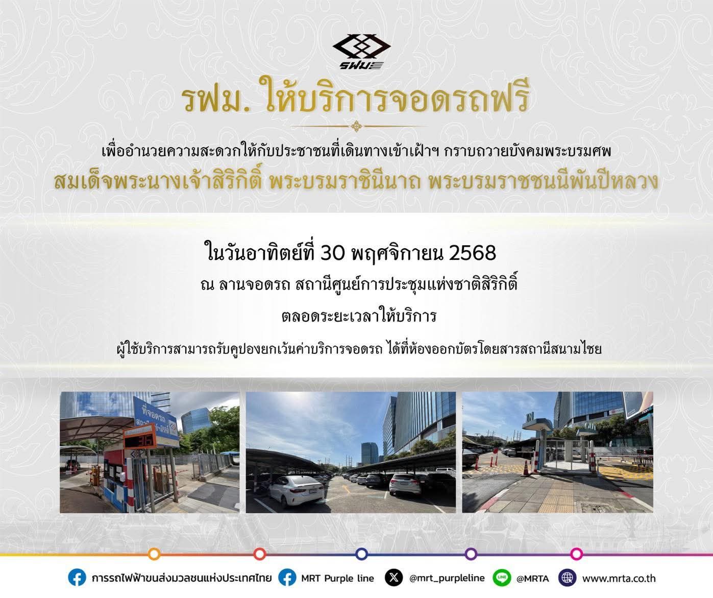 รฟม. ให้บริการจอดรถฟรีเพื่ออำนวยความสะดวกให้กับประชาชนที่เดินทางเข้าเฝ้าฯ กราบถวายบังคมพระบรมศพ สมเด็จพระนางเจ้าสิริกิติ์ พระบรมราชินีนาถ พระบรมราชชนนีพันปีหลวง