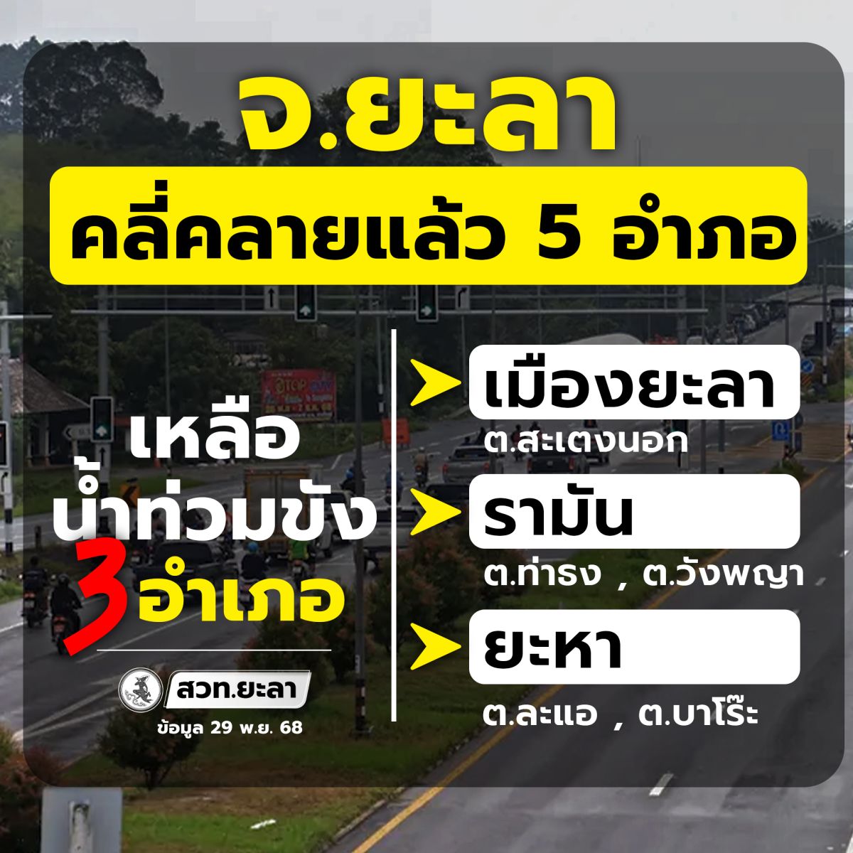 - พื้นที่ที่ยังคงเหลือน้ำท่วมขัง (ลุ่มต่ำ) 3 อำเภอ (เมืองยะลา, รามัน, ยะหา)