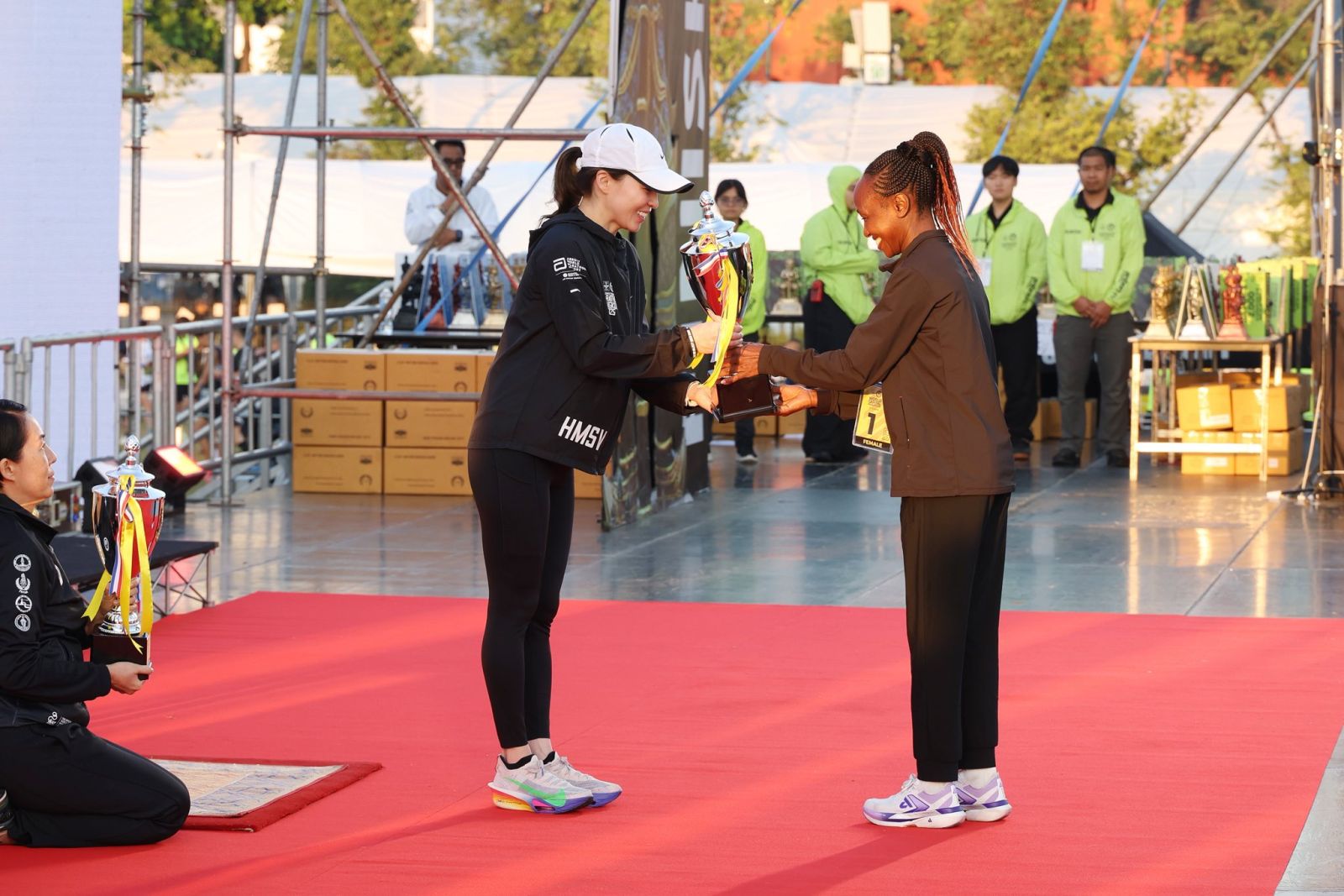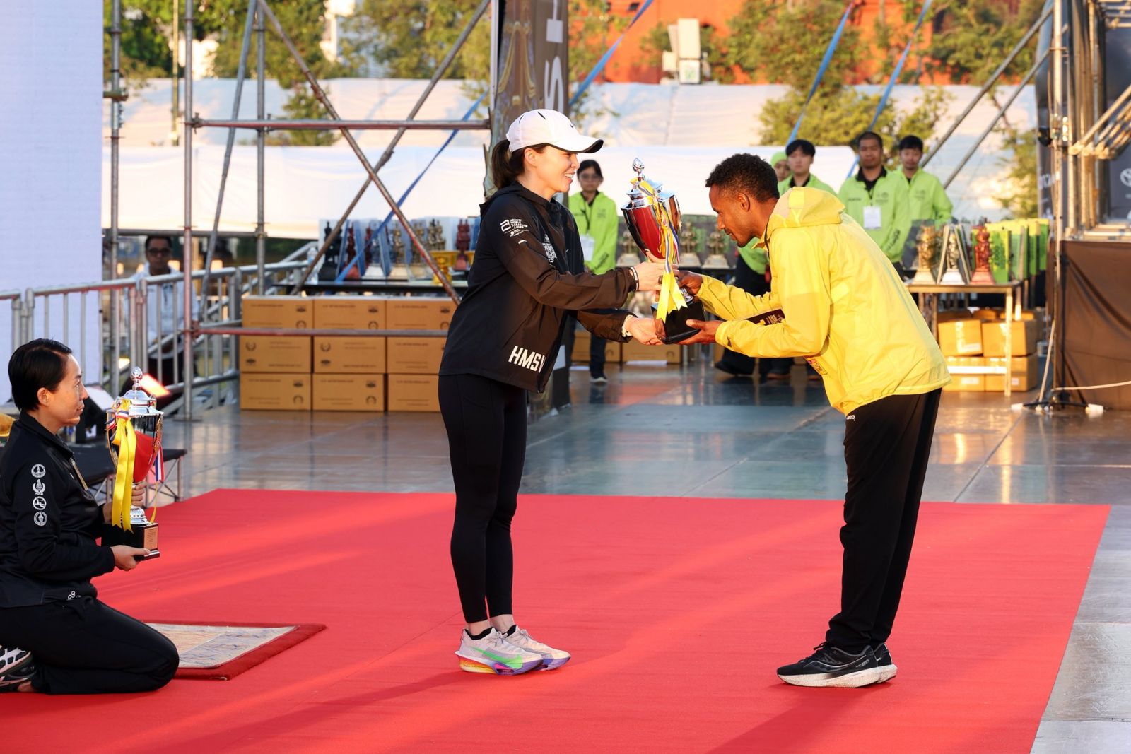 จากนั้นทรงพระดำเนินไปยัง พลับพลาพิธี ท้องสนามหลวง เพื่อพระราชทานถ้วยรางวัล แก่ผู้ชนะเลิศการแข่งขัน ระยะฮาล์ฟมาราธอน ๒๑.๑ กิโลเมตร จำนวน ๔ ราย ประกอบด้วยประเภทมืออาชีพ (อีลิทชาย) ๑ รางวัล ประเภทมืออาชีพ (อีลิทหญิง) ๑ รางวัล ประเภทบุคคลทั่วไป (ชายไทย) ๑ รางวัล ประเภทบุคคลทั่วไป (หญิงไทย) ๑ รางวัล และทรงฉายพระฉายาลักษณ์ร่วมกับนักวิ่งที่ชนะเลิศ คณะกรรมการจัดการแข่งขันฯ และผู้ให้การสนับสนุน ฯ ตามลำดับ