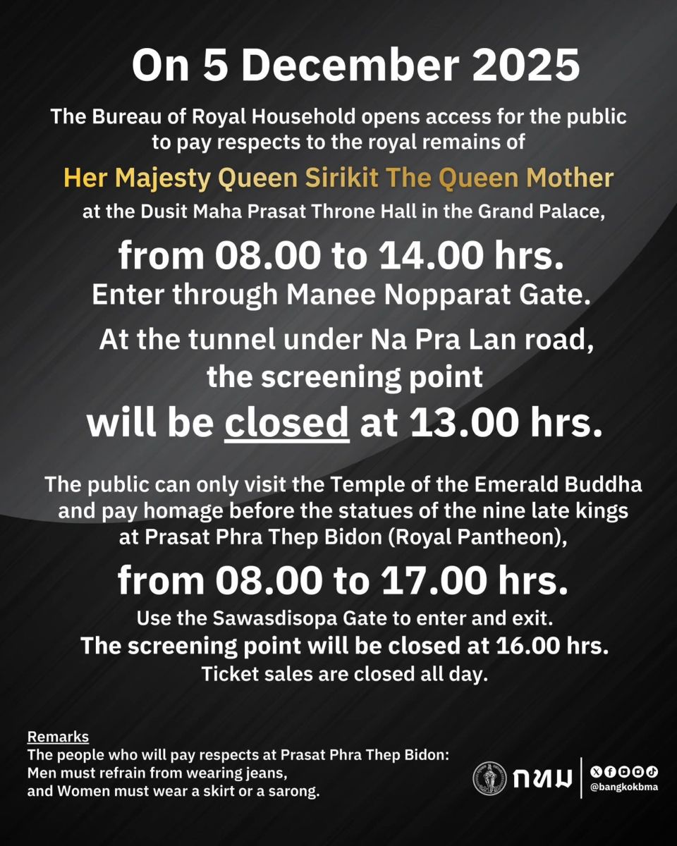5 ธันวาคม 2568 สำนักพระราชวังเปิดให้เข้า กราบถวายบังคมพระบรมศพ สมเด็จพระนางเจ้าสิริกิติ์ พระบรมราชินีนาถ พระบรมราชชนนีพันปีหลวง ณ พระที่นั่งดุสิตมหาปราสาท ในพระบรมมหาราชวัง
