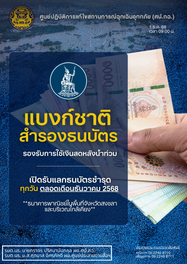 วันที่ 1 ธ.ค. 68 นางบุษกร ธีระปัญญาชัย ผู้ช่วยผู้ว่าการ สายโครงสร้างพื้นฐานและบริการระบบการชำระเงิน ธนาคารแห่งประเทศไทย ชี้แจงว่า แบงก์ชาติได้เตรียมธนบัตรไว้รองรับความต้องการใช้เงินสดของประชาชนในช่วงฟื้นฟูหลังน้ำท่วม ให้เพียงพอรองรับการเบิกจ่ายในช่วงที่มีความต้องการสูงกว่าปกติ รวมทั้ง ได้สำรองธนบัตรเพิ่มที่ศูนย์จัดการธนบัตรจังหวัดใกล้เคียง พร้อมนำมาสมทบที่หาดใหญ่หากมีความต้องการมากขึ้น นอกจากนี้ ได้ประสานให้สถาบันการเงินเตรียมกระจายธนบัตรไปถึงมือประชาชนผ่านสาขาและตู้ ATM ที่เปิดให้บริการด้วย