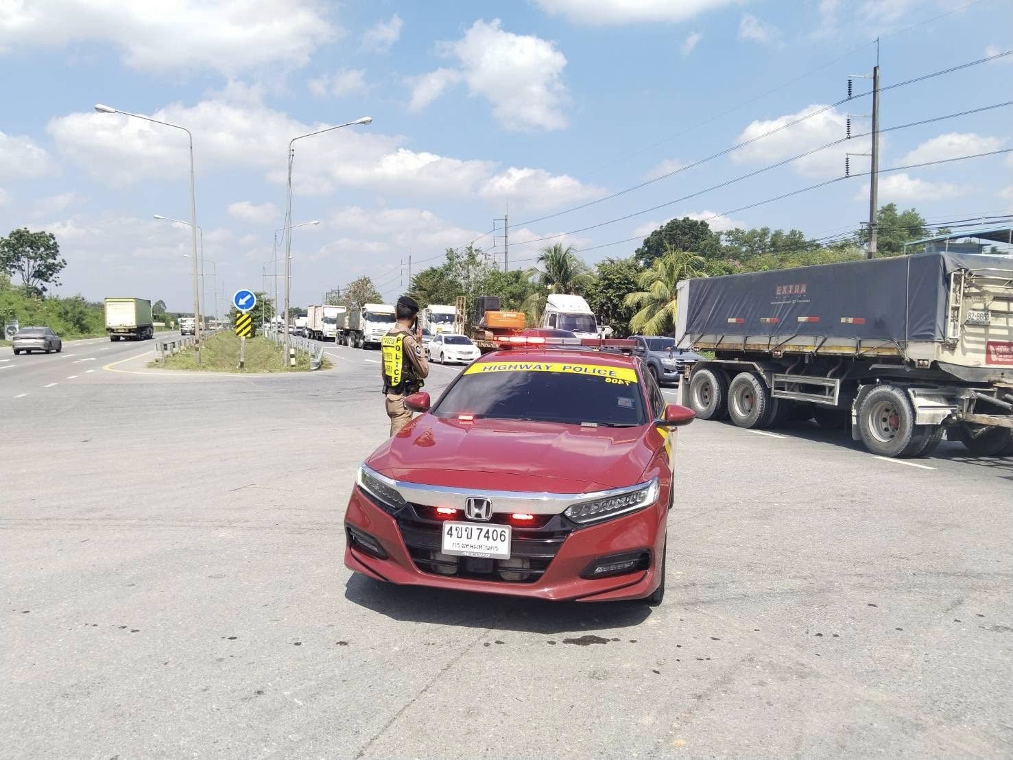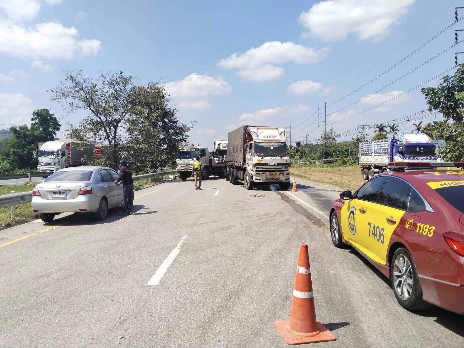 ตำรวจทางหลวงนครศรีธรรมราช โดย หน่วยบริการประชาชนตำรวจทางหลวงทุ่งสง รถวิทยุ 7406 อำนวยความสะดวงด้านการจราจร ทางหลวงหมายเลข 41 กม.283-284 ต.นาโพธิ์ อ.ทุ่งสง นครศรีธรรมราช เหตุรถบรรทุกชนท้ายกีดขวางการจราจร ฝั่งขาล่องใต้ ได้ประสานหมวดการทางทุ่งสง นำอุปกรณ์มาวางเพื่อเปิดช่องทางพิเศษให้รถวิ่งสวนเลนได้เพื่อระบายรถไม่ให้ติดข้ด