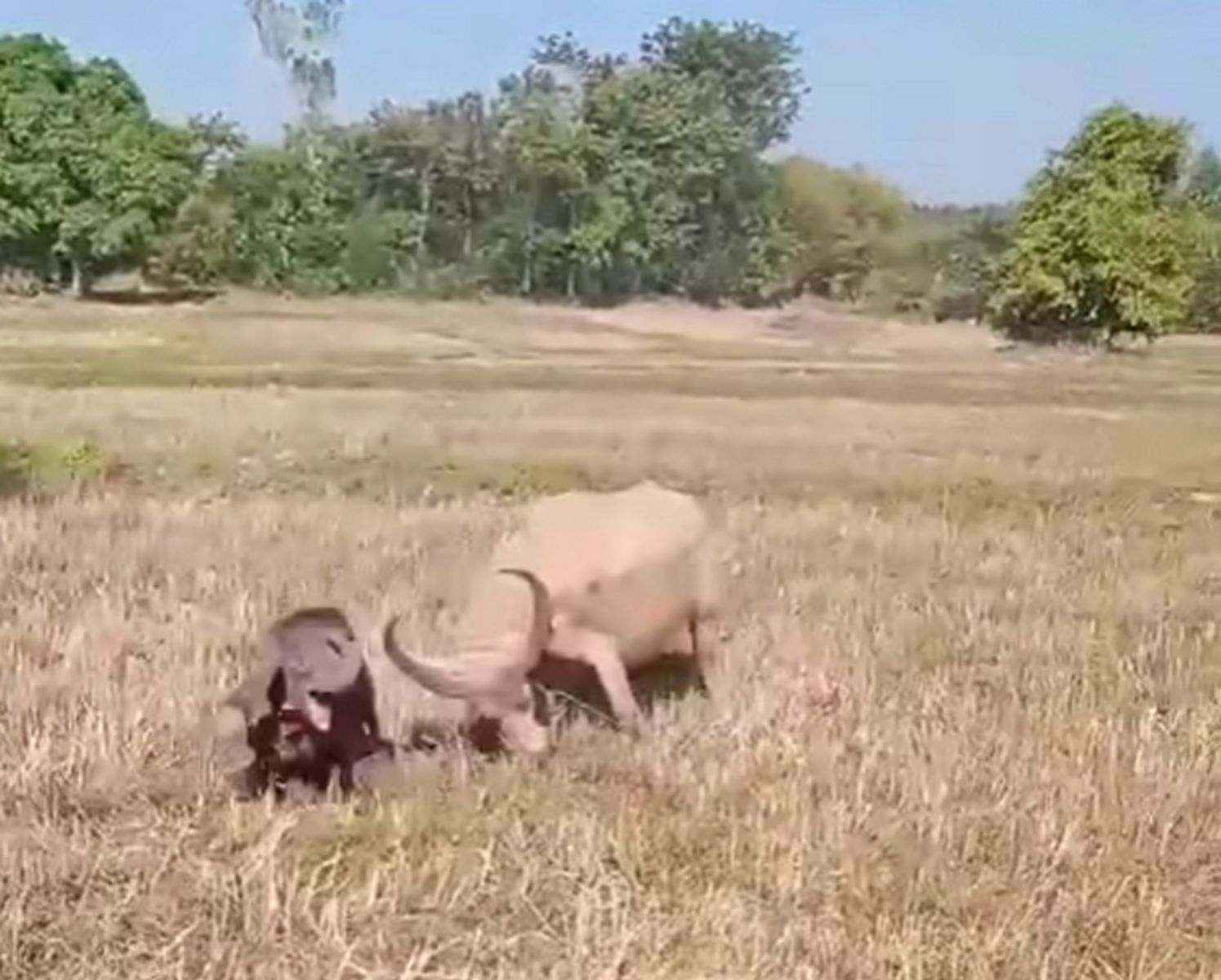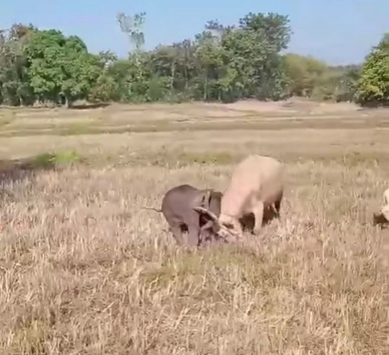ขณะที่เจ้าหน้าที่ลาดตระเวนในพื้นที่ก็ได้พบ ลูกช้างป่า ตัวหนึ่งพลัดหลงจากโขลง ไม่ทราบต้นทาง ซึ่งลูกช้างได้วิ่งเข้าไปในทุ่งนาที่มีควายเผือกที่ชาวบ้านนำมาเลี้ยงไว้ใน จึงเกิดเหตุปะทะกัน โดยควายเผือกตัวใหญ่ได้วิ่งเข้าขวิดใส่ลำตัวของลูกช้างอย่างแรงจนลูกช้างกระเด็น ทำให้ลูกช้างได้รับบาดเจ็บบริเวณลำคอและก้น แต่ยังสามารถเคลื่อนไหวได้