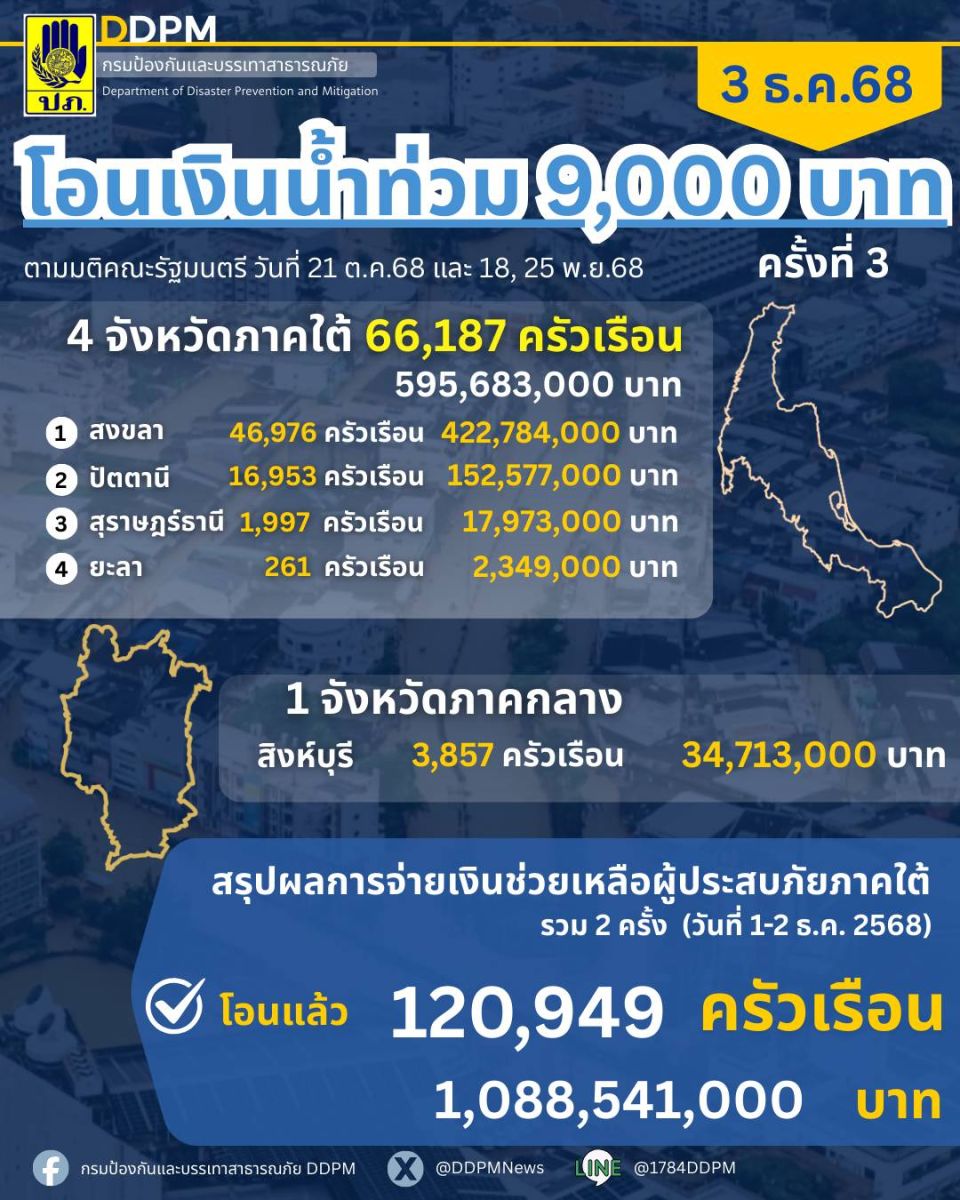 สำหรับวันนี้ (3 ธ.ค. 68) เป็นครั้งที่สามของการโอนเงินเยียวยา โดย ปภ. และธนาคารออมสินจะโอนเงินให้แก่ผู้ประสบภัยที่ลงทะเบียนและผ่านการตรวจสอบข้อมูลเรียบร้อยแล้ว รวม 70,044 ครัวเรือน แยกเป็นพื้นที่ภาคใต้ 4 จังหวัด ได้แก่ สุราษฎร์ธานี ปัตตานี สงขลา ยะลา รวม 66,187 ครัวเรือน แบ่งเป็น สุราษฎร์ธานี 1,997 ครัวเรือน ปัตตานี 16,953 ครัวเรือน สงขลา 46,976 ครัวเรือน (หาดใหญ่ 5,178 ครัวเรือน) และยะลา 261 ครัวเรือน รวมเป็นวงเงินทั้งสิ้น 595,683,000 บาท และพื้นที่ภาคกลาง 1 จังหวัด ได้แก่ สิงห์บุรี จำนวน 3,857 ครัวเรือน วงเงินทั้งสิ้น 34,713,000 บาท ผ่านบัญชีพร้อมเพย์ที่ผูกกับเลขประจำตัวประชาชน โดยเงินจะโอนเข้าบัญชีผู้ประสบภัยในวันนี้ตั้งแต่เวลา 13.00 น. เป็นต้นไป