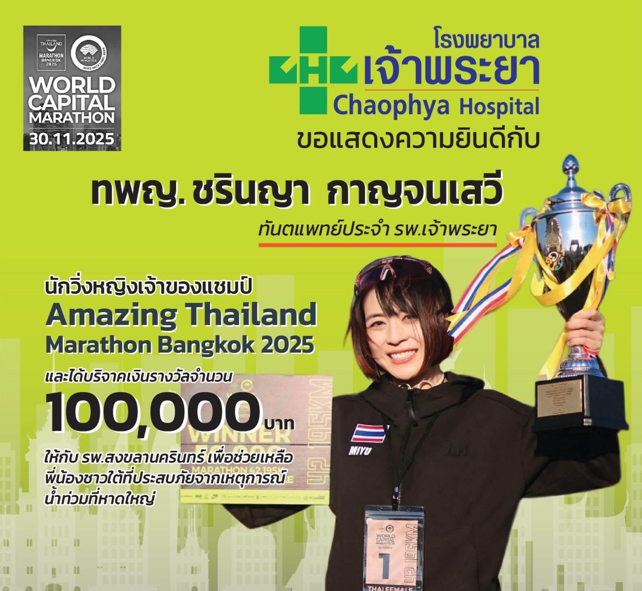 รพ.เจ้าพระยาขอแสดงความยินดีกับ ทพญ.ชรินญา กาญจนเสวี #คุณหมอมิยู ทันตแพทย์ประจำรพ.เจ้าพระยาได้รับถ้วยพระราชทานพระบาทสมเด็จพระเจ้าอยู่หัว จากพระหัตถ์สมเด็จพระนางเจ้าฯ พระบรมราชินี ในฐานะนักวิ่งหญิงไทยเจ้าของแชมป์ Amazing Thailand Marathon Bangkok 2025 ส่วนเงินรางวัลในครั้งนี้คุณหมอมิยูได้บริจาคทั้งหมดพร้อมเงินสมทบจากผู้สนับสนุนรวม 100,000 บาท ให้แก่ รพ.สงขลานครินทร์ เพื่อช่วยเหลือพี่น้องชาวใต้ที่ประสบภัยจากเหตุการณ์น้ำท่วม สร้างความภาคภูมิใจให้กับทีมแพทย์และรพ.เจ้าพระยาเป็นอย่างยิ่ง ท่านที่สนใจบริการด้านทันตกรรมหรือต้องการนัดหมายทันตแพทย์ ติดต่อได้ที่ ศูนย์ทันตกรรม โทร. 02-434-1111, 02-884-7000