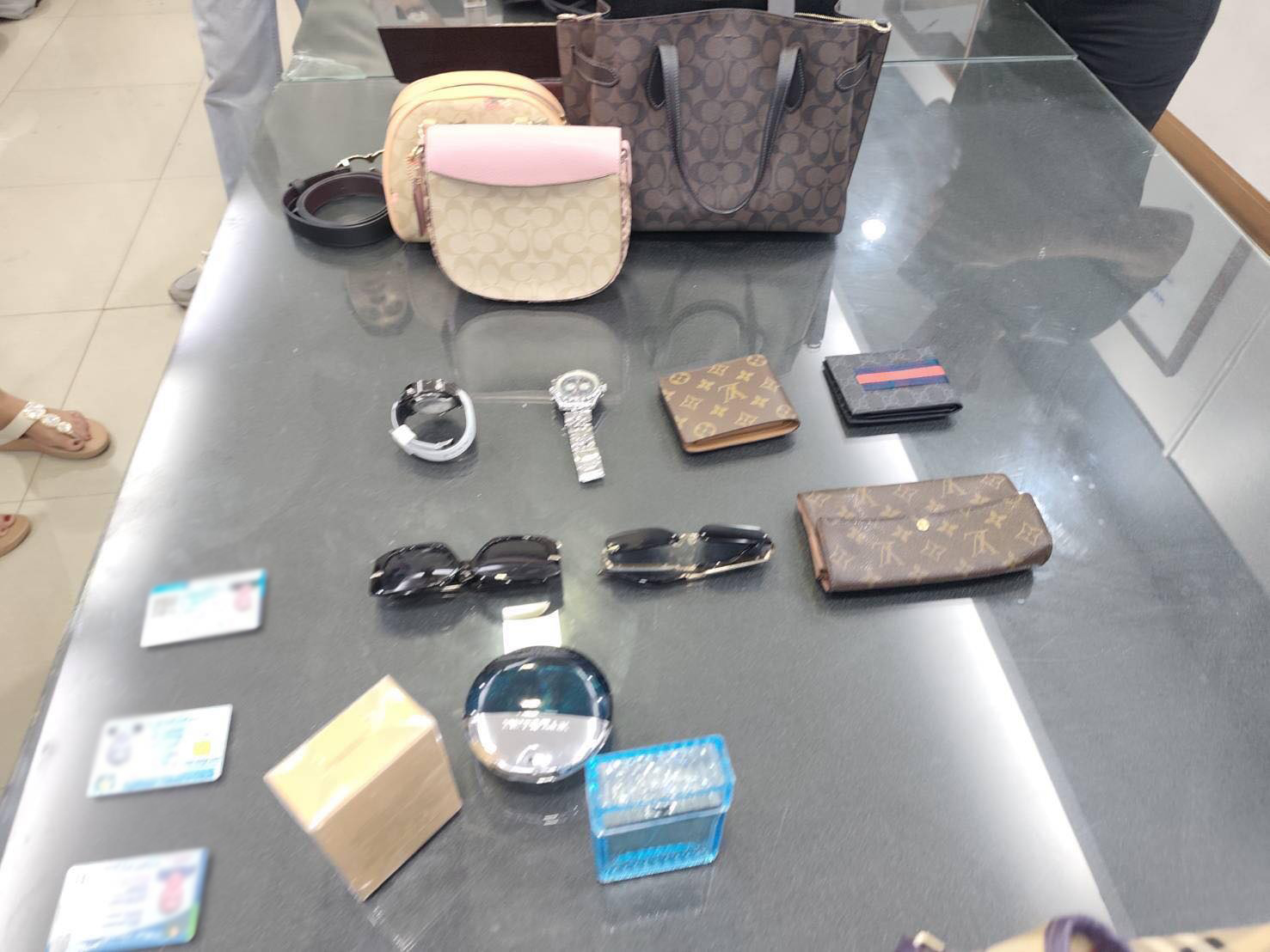 พร้อมของกลาง กระเป๋าถือ กระเป๋าสตางค์ เข็มขัด แว่น น้ำหอม นาฬิกา แบรนด์เนม รวม 18 รายการ และขยายผลตรวจยึดรถเก๋ง สีขาว หมายเลขทะเบียน กรุงเทพมหานคร ที่ใช้ก่อเหตุ พร้อมแผ่นป้ายทะเบียนปลอมที่นำโยนทิ้งข้างทาง