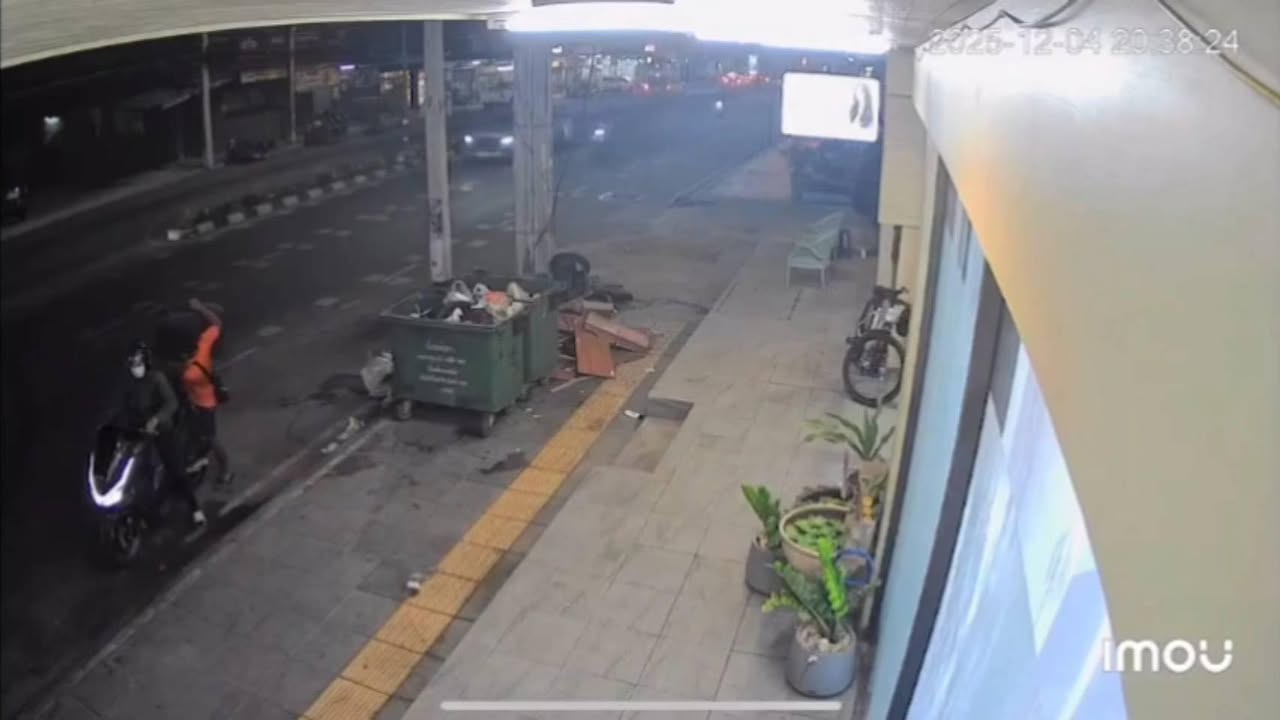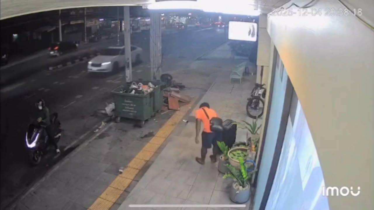 เพียงไม่ถึง 5 นาที กล้องวงจรปิดจับภาพชาย 2 คน ขี่รถจักรยานยนต์ Honda PCX สีดำ (ไม่ทราบทะเบียน) คนขับสวมเสื้อสีดำกางเกงสีดำ ส่วนคนซ้อนท้ายสวมเสื้อสีส้มกางเกงขาสั้นสีดำ ลงจากรถแล้วเดินตรงเข้ามาหยิบกระเป๋าเดินทางของผู้เสียหาย ก่อนอุ้มขึ้นรถจักรยานยนต์และขับหลบหนีอย่างรวดเร็ว