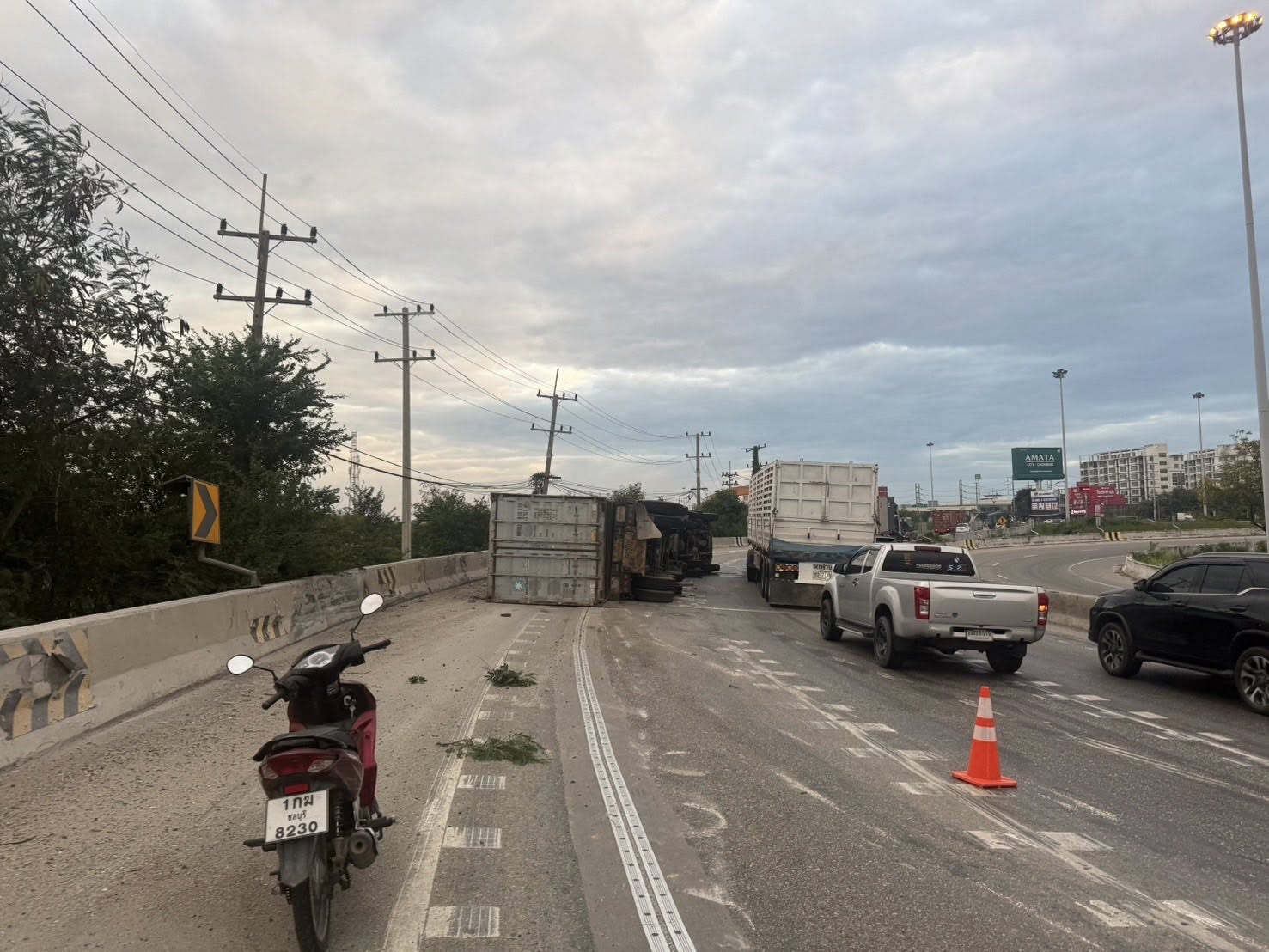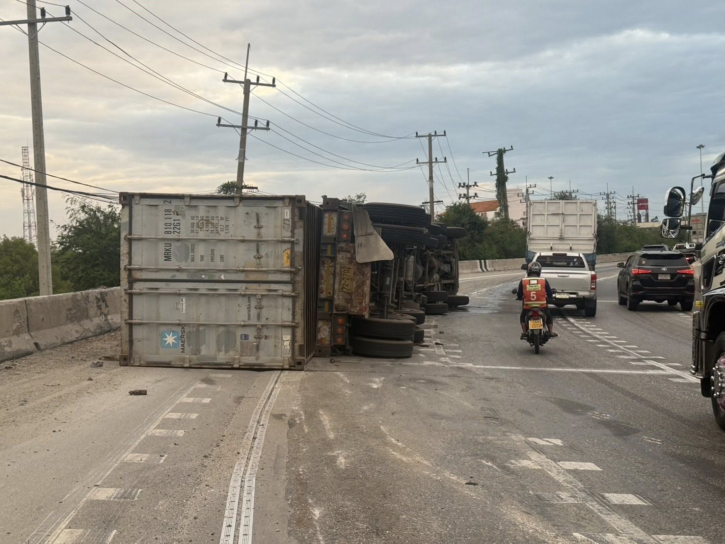 วันที่ 5 ธันวาคม 2568 เวลาประมาณ 07.10 น. ทางหลวงหมายเลข 361 ถนนเลี่ยงเมืองชลบุรี ขาเข้า มุ่งหน้ากรุงเทพ บนสะพานต่างระดับหนองไม้แดง รถบรรทุกพ่วงบรรทุกตู้คอนเทนเนอร์ พลิกตะแคง ส่งผลให้การจราจรติดขัดมาก มีจราจร สภ.เมืองชลบุรี คอยอำนวยความสะดวก รถผ่านได้ 1 ช่องทาง