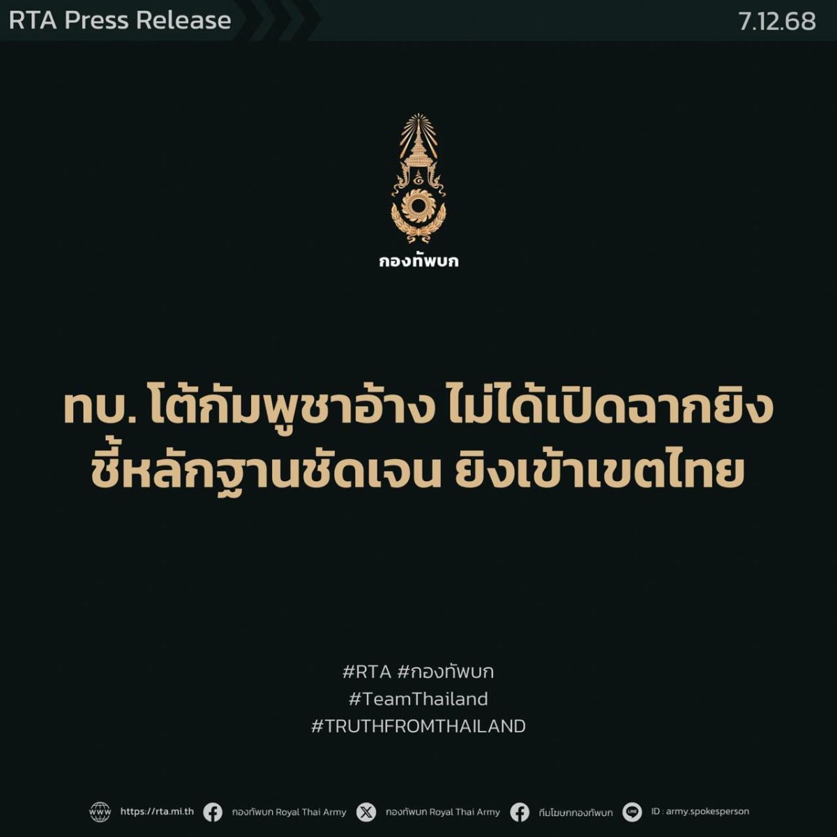 ทบ. โต้คำแถลงกัมพูชาอ้างไม่ได้ยิงเข้ามา ชี้หลักฐานชัดเจนฝ่ายกัมพูชาเปิดฉากยิง จนกำลังพลได้รับบาดเจ็บ 2 นาย ขณะปฏิบัติหน้าที่ในเขตไทย