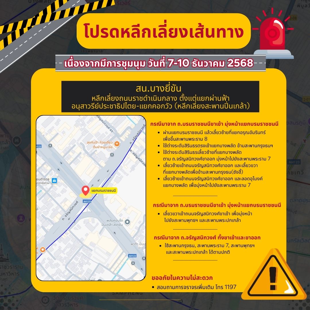 บช.น. แนะ หลีกเลี่ยงเส้นทาง ถนนหลานหลวง - ถนนราชดำเนินกลาง เนื่องจากมีการชุมนุม วันที่ 7 - 10 ธันวาคม 2568
