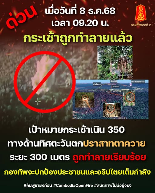 8 ธันวาคม 2568 เพจกองทัพภาคที่ 2 โพสต์ข้อความ ระบุ "ด่วน!!! "กระเช้าเนิน350" ถูกทำลายแล้ว เมื่อ 8 ธ.ค.68เวลา 09.20 น. เป้าหมายกระเช้าเนิน 350 ทางด้านทิศตะวันตกปราสาทตาควาย ระยะ 300 เมตร ถูกทำลายเรียบร้อย กองทัพจะปกป้องประชาชนและอธิปไตยเต็มกำลัง และ "กองทัพภาคที่ 2 ขอแจ้งเตือนหน่วยงานที่เกี่ยวข้อง "ยกระดับมาตราการรักษาความปลอดภัย" อาคารสถานที่ราชการที่สำคัญ และป้องกัน ขัดขวาง การปฏิบัติของฝ่ายตรงข้าม ที่มุ่งสร้างความเสียหายให้กับชีวิตและทรัพย์สินกองทัพจะปกป้องประชาชนและอธิปไตยเต็มกำลัง"