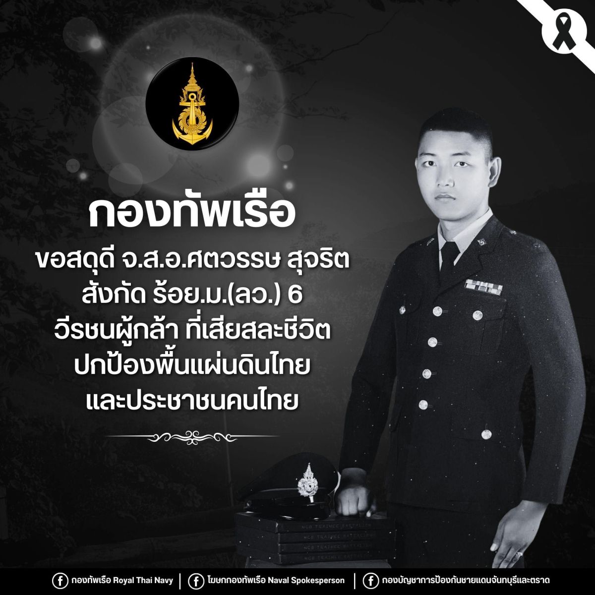 กำลังพลที่ล่วงลับได้ทำหน้าที่ด้วยเกียรติ ศักดิ์ศรี และความรับผิดชอบสูงสุดต่อภารกิจของประเทศชาติ กองทัพเรือขอประกาศยกย่องในฐานะทหารผู้ยืนหยัดปฏิบัติหน้าที่จนวาระสุดท้าย อันเป็นเกียรติสูงสุดของผู้สวมเครื่องแบบและรับภาระหน้าที่ในการปกป้องอธิปไตยของชาติ