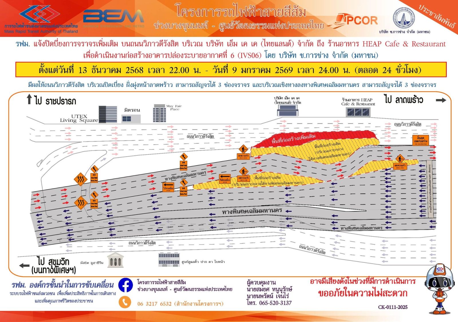 รฟม. แจ้งปิดเบี่ยงการจราจรเพิ่มเติม บนถนนวิภาวดีรังสิต บริเวณ บริษัท เอ็ม เค เค (ไทยแลนด์) จำกัด ถึง ร้านอาหาร HEAP Cafe & Restaurant เพื่อดำเนินงานก่อสร้างอาคารปล่องระบายอากาศที่ 6 (IVS06) โครงการรถไฟฟ้าสายสีส้ม ช่วงบางขุนนนท์ - ศูนย์วัฒนธรรมแห่งประเทศไทย ตั้งแต่วันที่ 13 ธันวาคม 2568 เวลา 22.00 น.– 9 มกราคม 2569 เวลา 24.00 น. (ตลอด 24 ชั่วโมง)