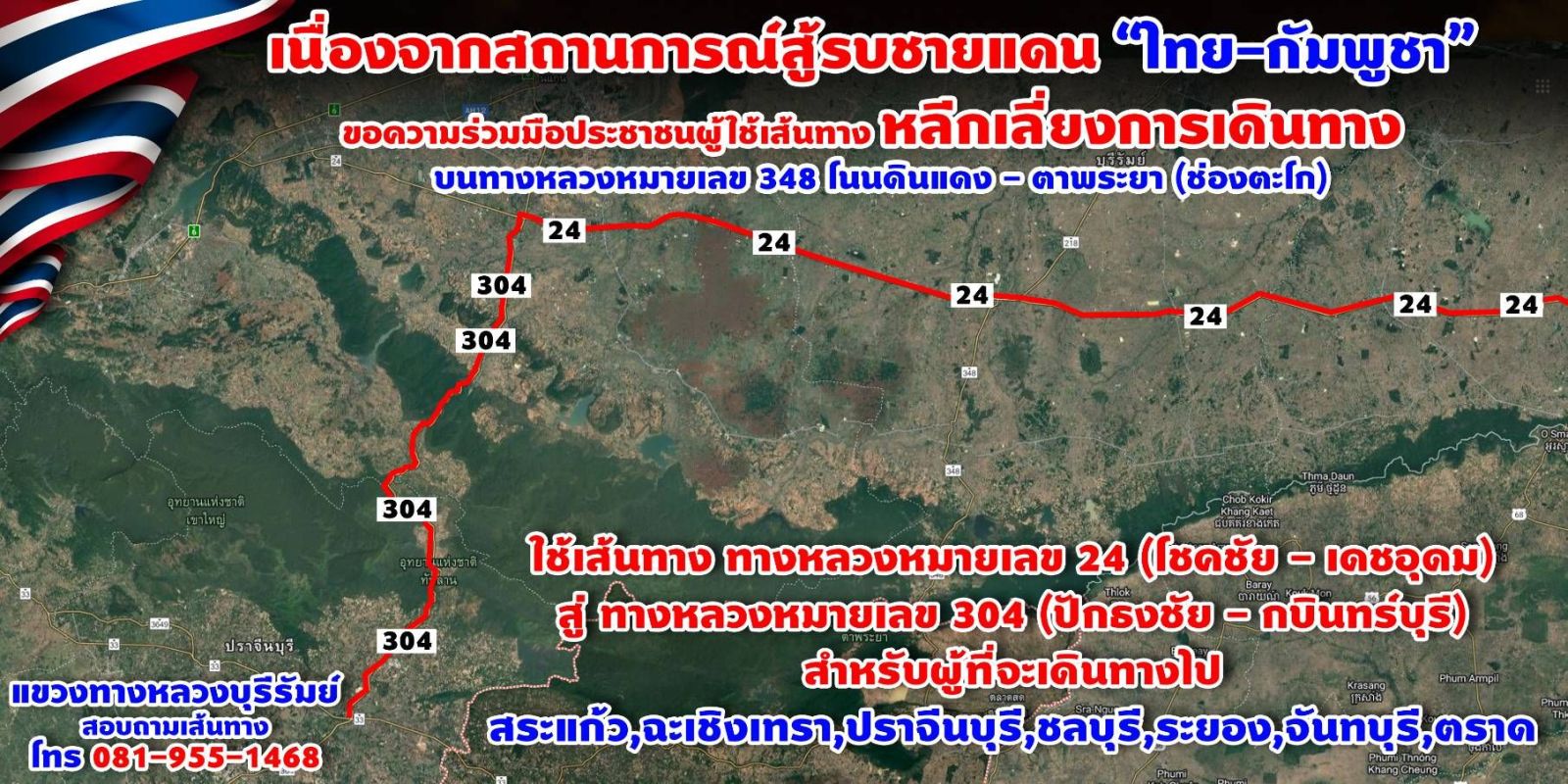 ในการนี้ จังหวัดบุรีรัมย์ จึงได้ขอความร่วมมือมายังท่านเพื่อให้ดําเนินการประชาสัมพันธ์ ให้ประชาชนได้รับทราบ เพื่อหลีกเลี่ยงการใช้เส้นทาง ทางหลวงหมายเลข 348 โนนดินแดง - ตาพระยา (ช่องตะโก) ด้านจังหวัดบุรีรัมย์ สําหรับผู้ที่จะเดินทางไปจังหวัดสระแก้ว จังหวัดปราจีนบุรี จังหวัด ฉะเชิงเทรา จังหวัดชลบุรี จังหวัดจันทบุรี จังหวัดระยอง และจังหวัดตราด ทั้งนี้ ตั้งแต่บัดนี้เป็นต้นไป จนกว่าสถานการณ์จะเข้าสู่ภาวะปกติ