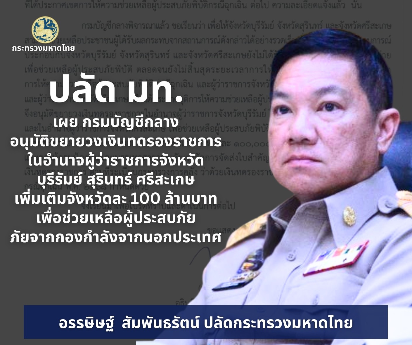 "ปลัดมหาดไทย" เผย กรมบัญชีกลาง อนุมัติขยายวงเงินทดรองราชการในอำนาจผู้ว่าราชการจังหวัดบุรีรัมย์ สุรินทร์ ศรีสะเกษ เพื่อช่วยเหลือผู้ประสบภัยพิบัติกรณีฉุกเฉิน ภัยจากกองกำลังจากนอกประเทศ เพิ่มเติม จังหวัดละ 100 ล้านบาท