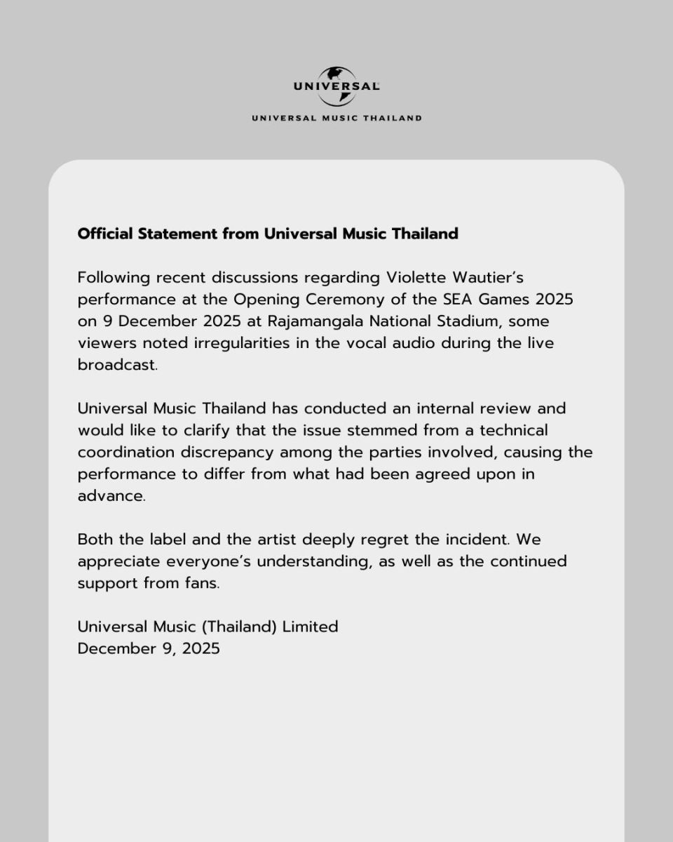Universal Music Thailand ต้นสังกัดของ วี ไวโอเลต แถลงชี้แจงกรณี เสียงร้องของศิลปินมีความไม่สมบูรณ์ระหว่างการออกอากาศ