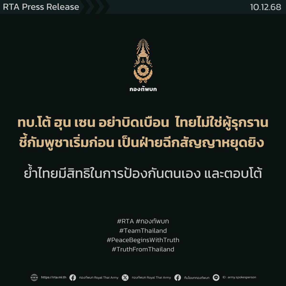 ต่อกรณีดังกล่าว วันนี้ (10 ธ.ค. 68) พลตรี วินธัย สุวารี โฆษกกองทัพบก ได้ออกมาชี้แจงว่า