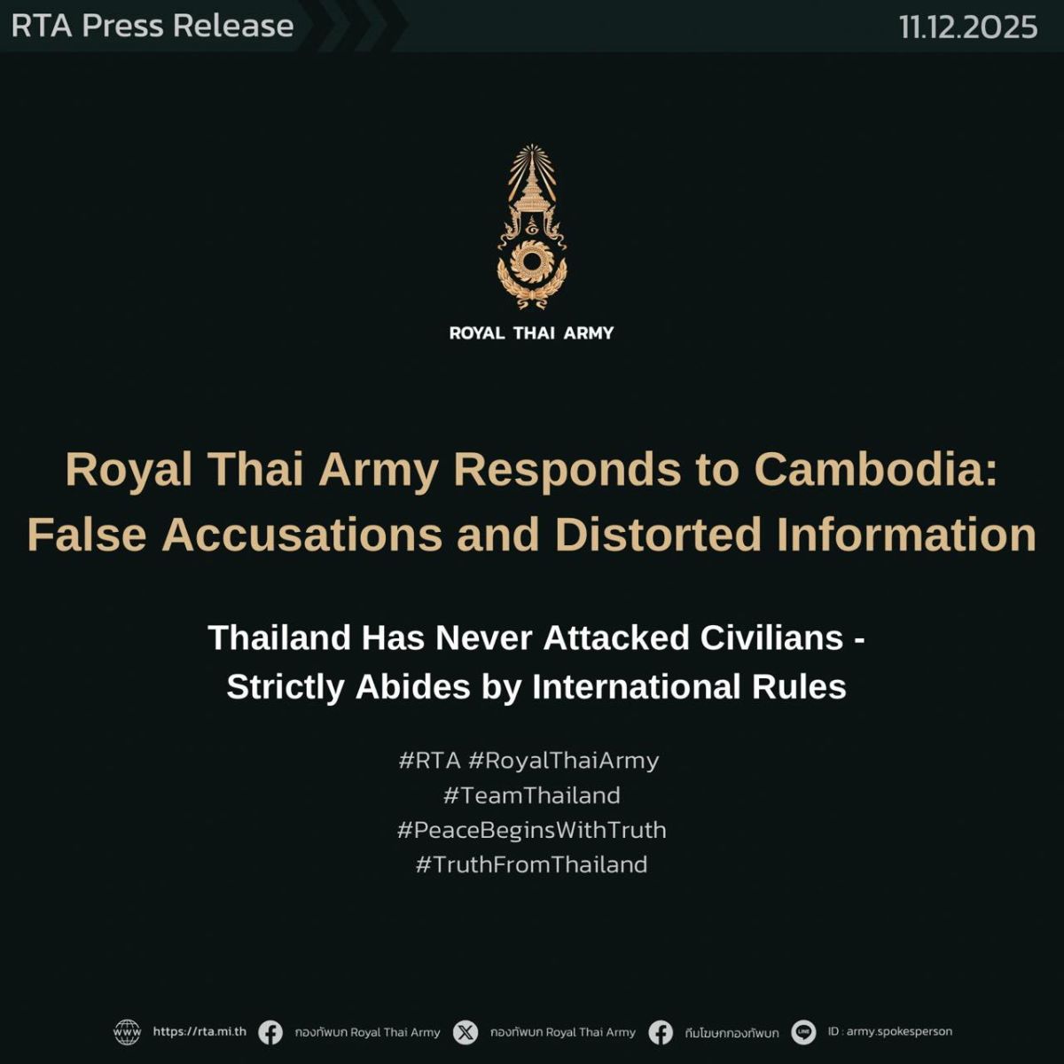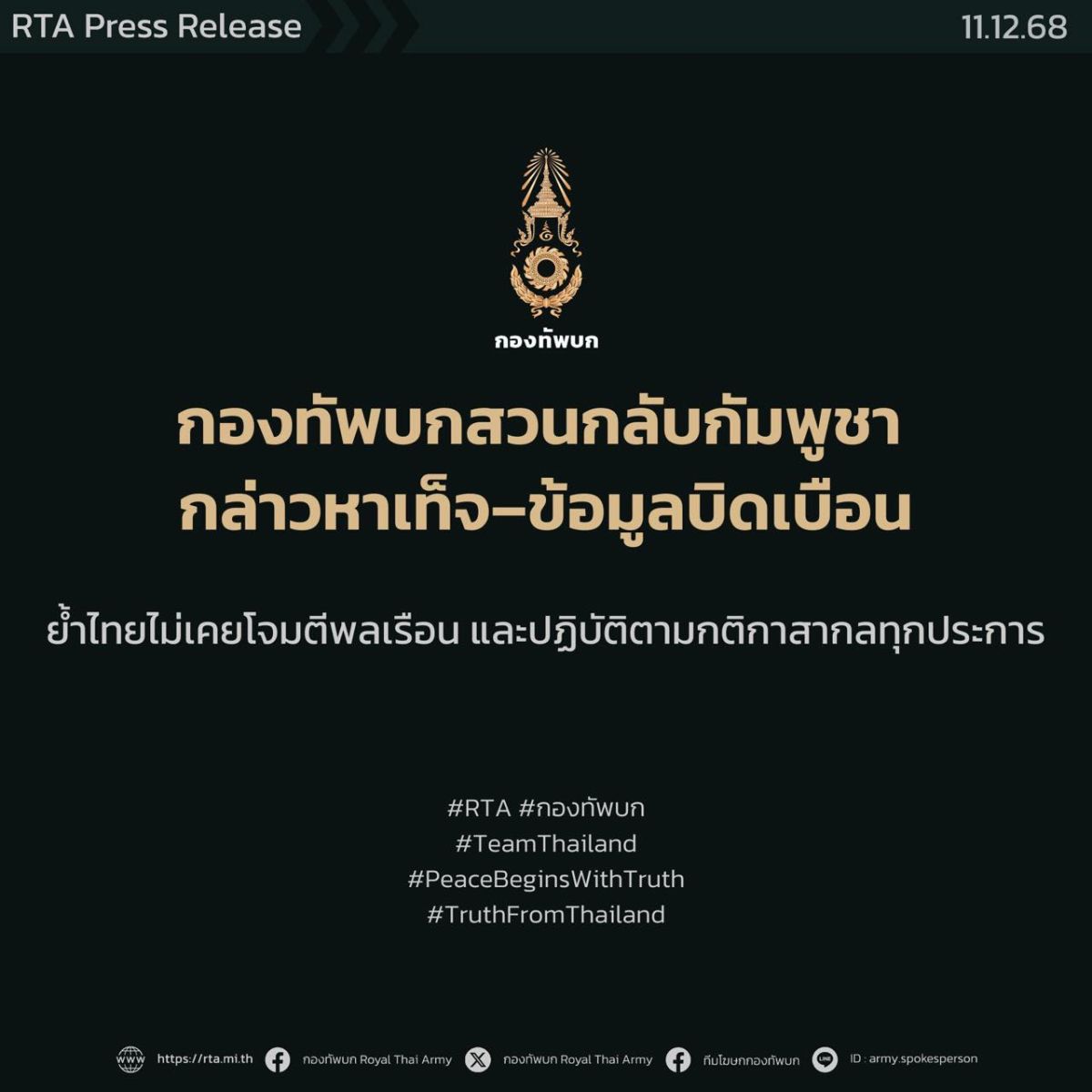 (11 ธ.ค.68) พลตรี วินธัย สุวารี โฆษกกองทัพบก กล่าวว่าจากถ้อยแถลงของพลโท มาลี โสเจียตา โฆษกกระทรวงกลาโหมกัมพูชา เมื่อ 11 ธ.ค.68 เป็นการกล่าวที่บิดเบือนไปจากข้อเท็จจริงทุกประเด็น ดังนี้
