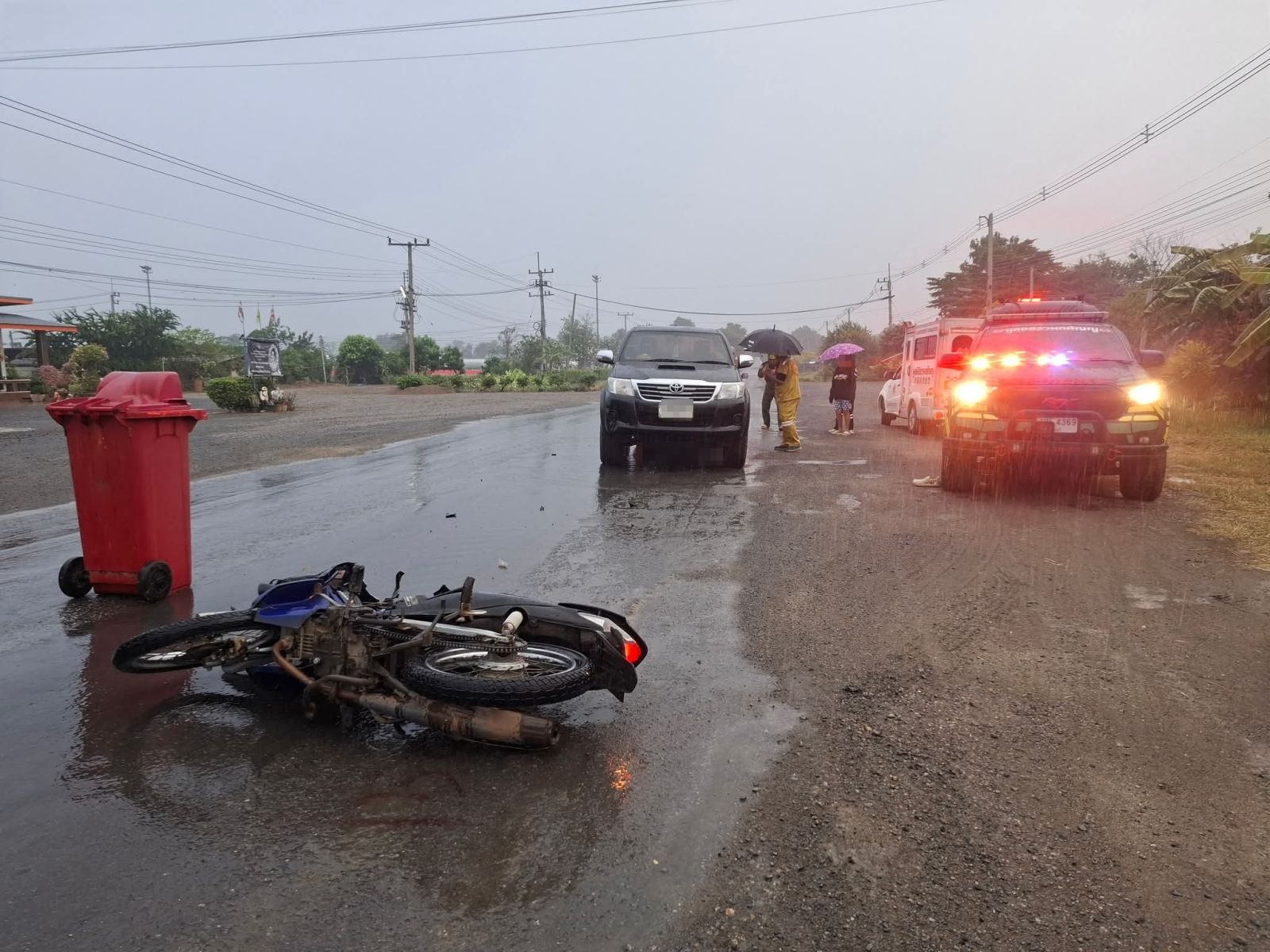 หญิงวัย 35 ปีขี่จักรยานยนต์เสียหลักล้ม รถไถลข้ามเลนชนกับกระบะ เสียชีวิตอยู่ใต้ท้องรถ จ.ลพบุรี