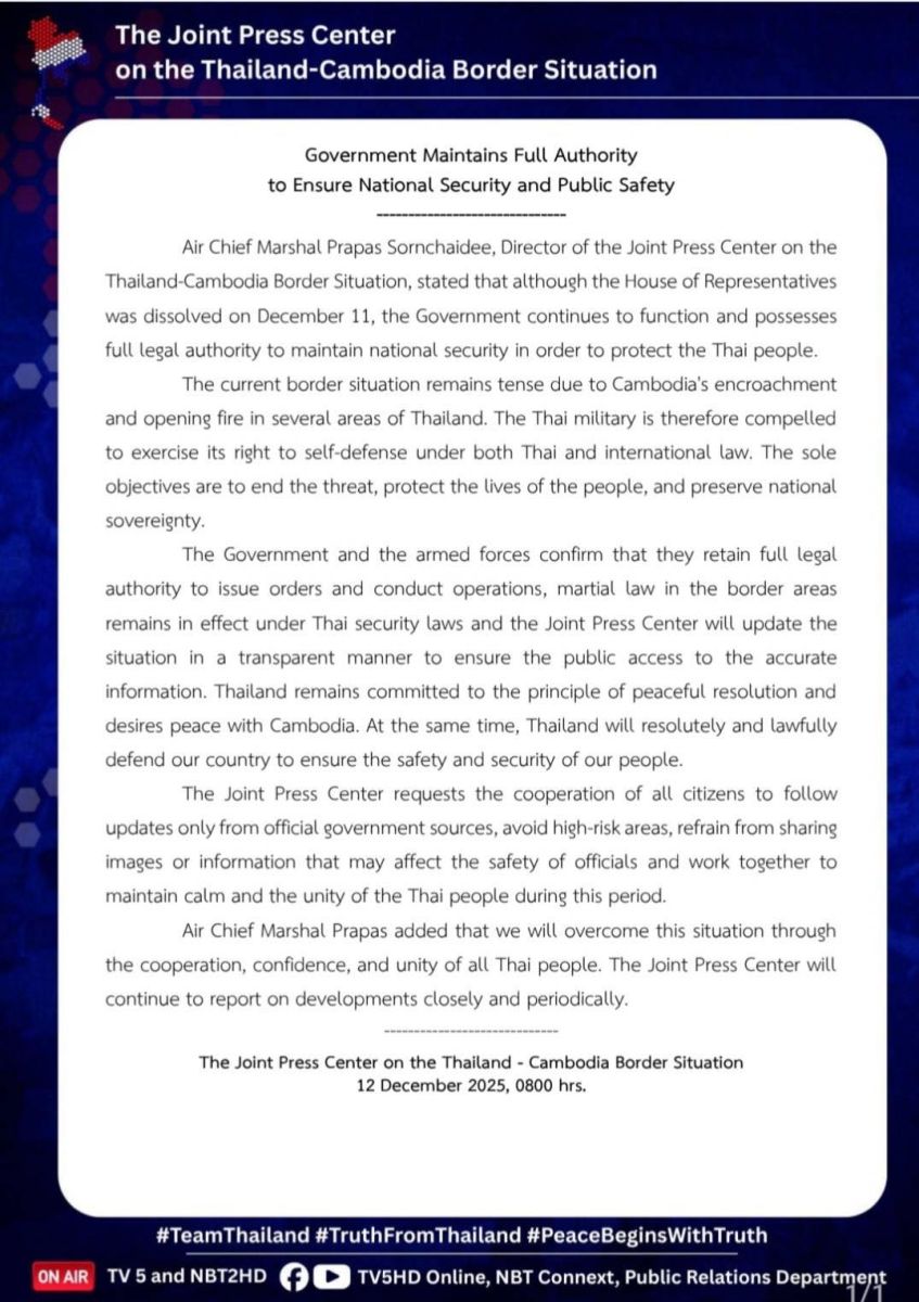 กฎอัยการศึกในพื้นที่ชายแดนมีผลบังคับใช้ตามกฎหมายความมั่นคงของไทย และศูนย์แถลงข่าวร่วมฯ จะรายงานสถานการณ์อย่างโปร่งใส เพื่อให้ประชาชนได้รับข้อมูลที่ถูกต้อง ประเทศไทยยังคงยึดมั่นในหลักสันติวิธี และปรารถนาสันติภาพกับกัมพูชา แต่ในขณะเดียวกันจะปกป้องแผ่นดินไทยอย่างเด็ดขาด และชอบธรรม เพื่อความสงบสุขของประชาชนไทยเป็นสําคัญ