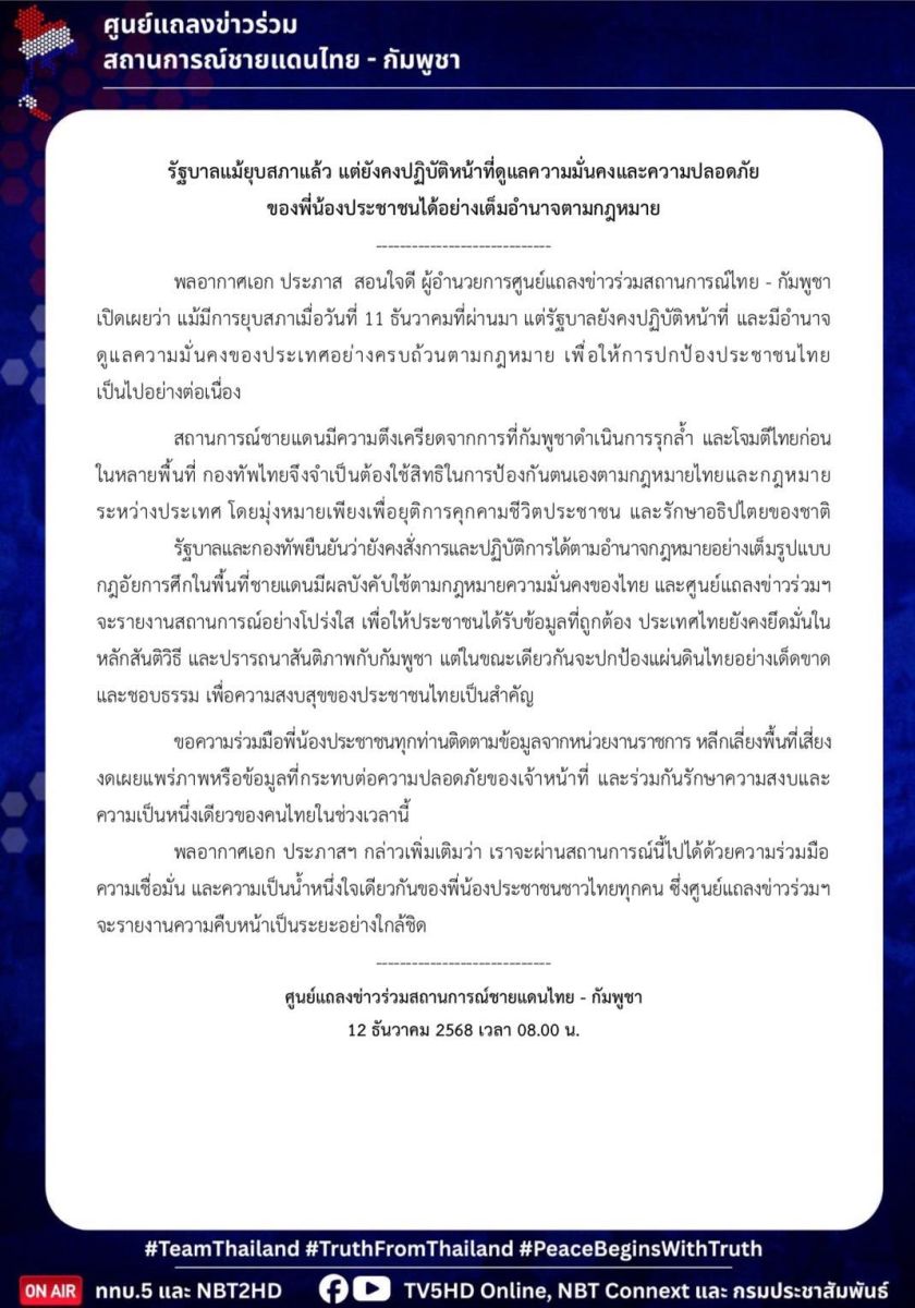 วันที่ 12 ธันวาคม 2568 เพจกองบัญชาการกองทัพไทย Royal Thai Armed Forces Headquarters โพสต์ข้อความระบุ พลอากาศเอก ประภาส สอนใจดี ผู้อํานวยการศูนย์แถลงข่าวร่วมสถานการณ์ไทย – กัมพูชา เปิดเผยว่า แม้มีการยุบสภาเมื่อวันที่ 11 ธันวาคมที่ผ่านมา แต่รัฐบาลยังคงปฏิบัติหน้าที่ และมีอํานาจ ดูแลความมั่นคงของประเทศอย่างครบถ้วนตามกฎหมาย เพื่อให้การปกป้องประชาชนไทยเป็นไปอย่างต่อเนื่อง