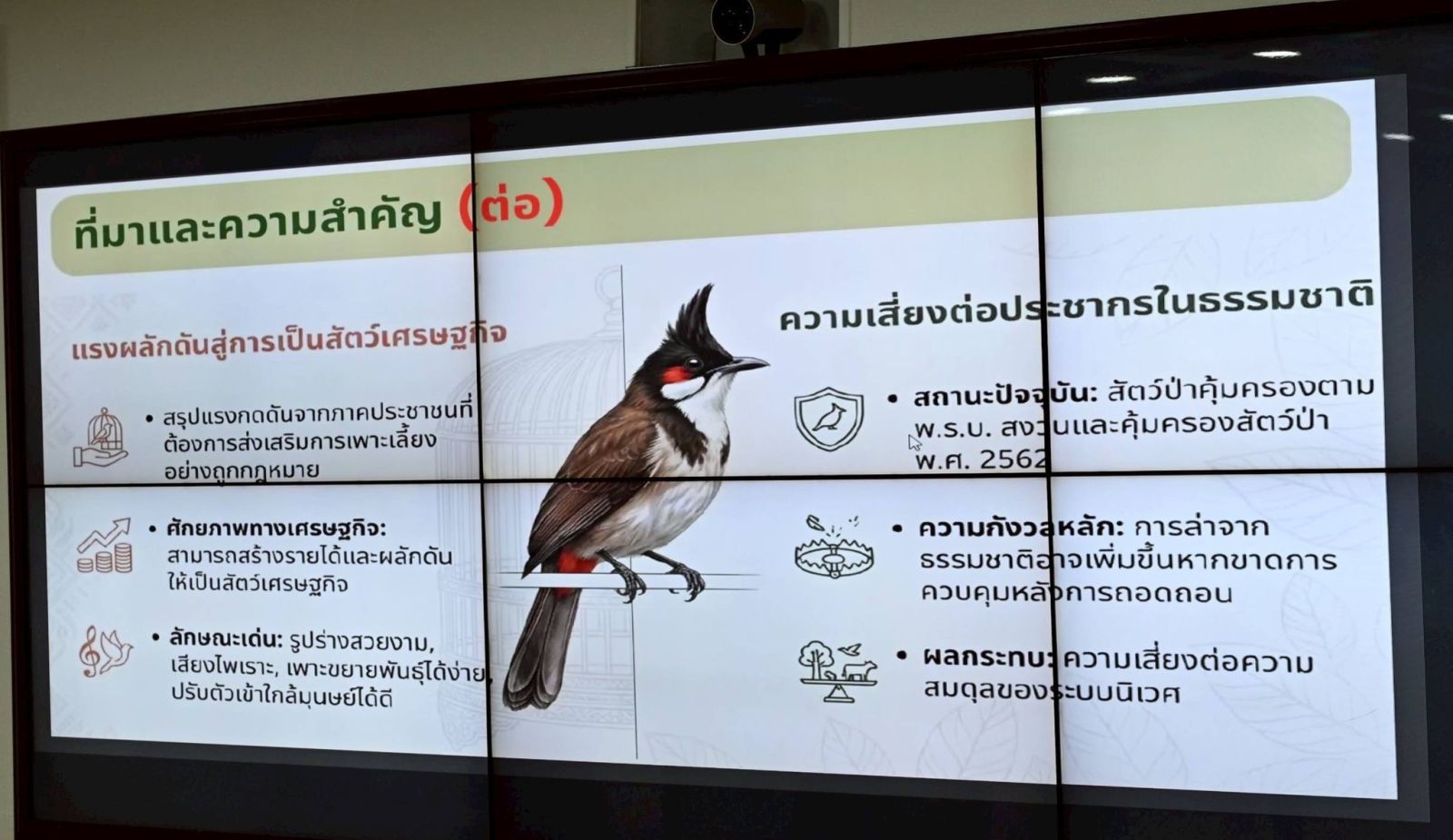 ที่ประชุมได้พิจารณารายงานจากคณะทำงาน 4 คณะ ซึ่งประเมินสถานภาพนกปรอดหัวโขนอย่างรอบด้าน พบว่ามีนกกระจายตัวในป่าธรรมชาติทั่วประเทศ มากกว่า 44,000 ตัว โดยเกินครึ่งหนึ่งอยู่ในเขตป่าอนุรักษ์และป่าสงวน ขณะเดียวกันแนวโน้มคดีลักลอบล่าในช่วง 5 ปีที่ผ่านมา ไม่มีการเพิ่มขึ้น