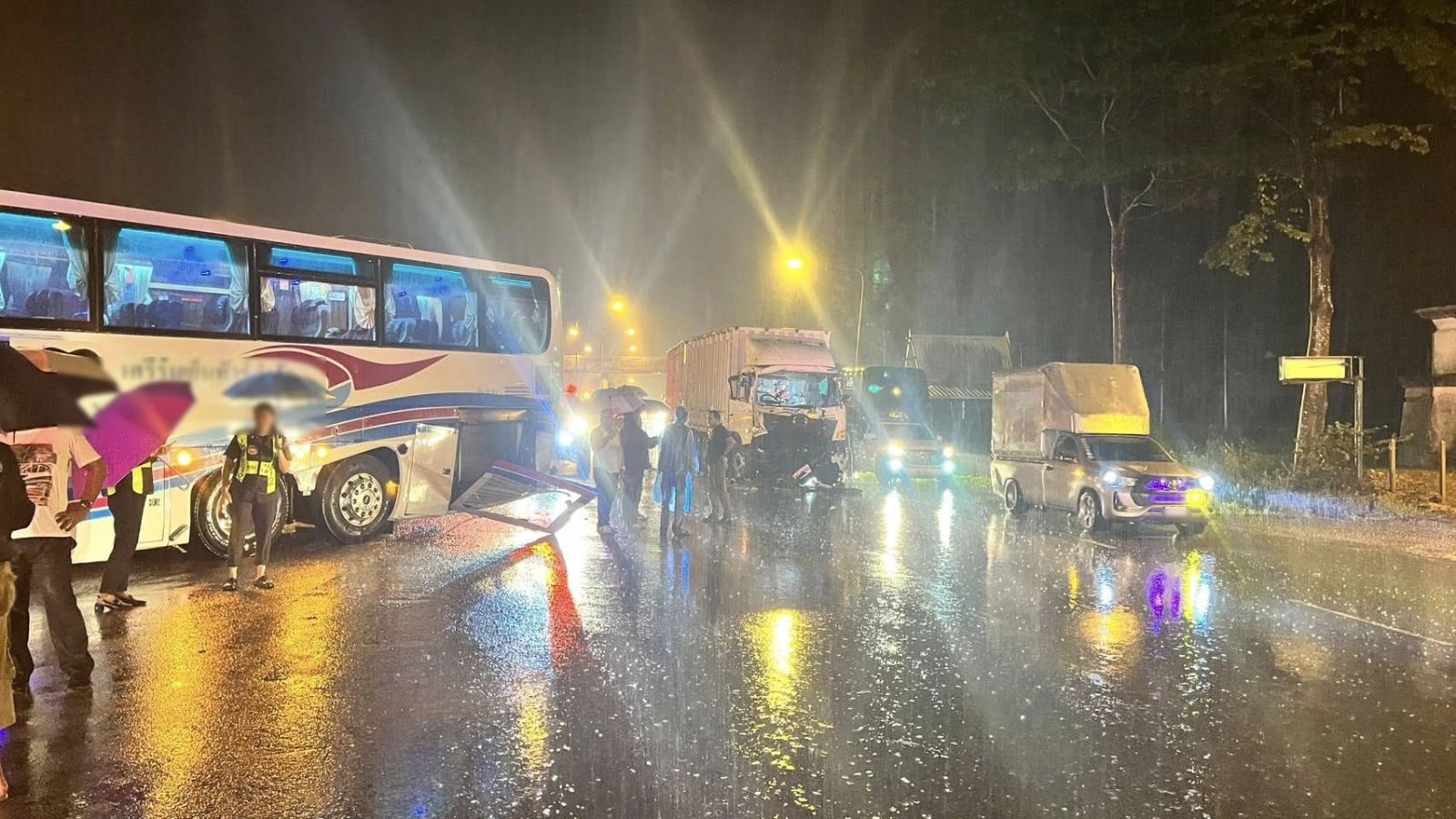 เมื่อเวลา 23.30 น. ของวันที่ 12 ธันวาคม 2568 ศูนย์วิทยุกู้ภัยสายชลชุมพร ได้รับแจ้งมีอุบัติเหตุ รถบรรทุกชนกับรถทัวร์ และมีผู้บาดเจ็บ ถนนเพชรเกษม ฝั่งขาขึ้น กทม. บริเวณทางกลับรถเขาพาง เยื้องสถานีตำรวจทางหลวงท่าแซะ ในพื้นที่ อ.ท่าแซะ จ.ชุมพร