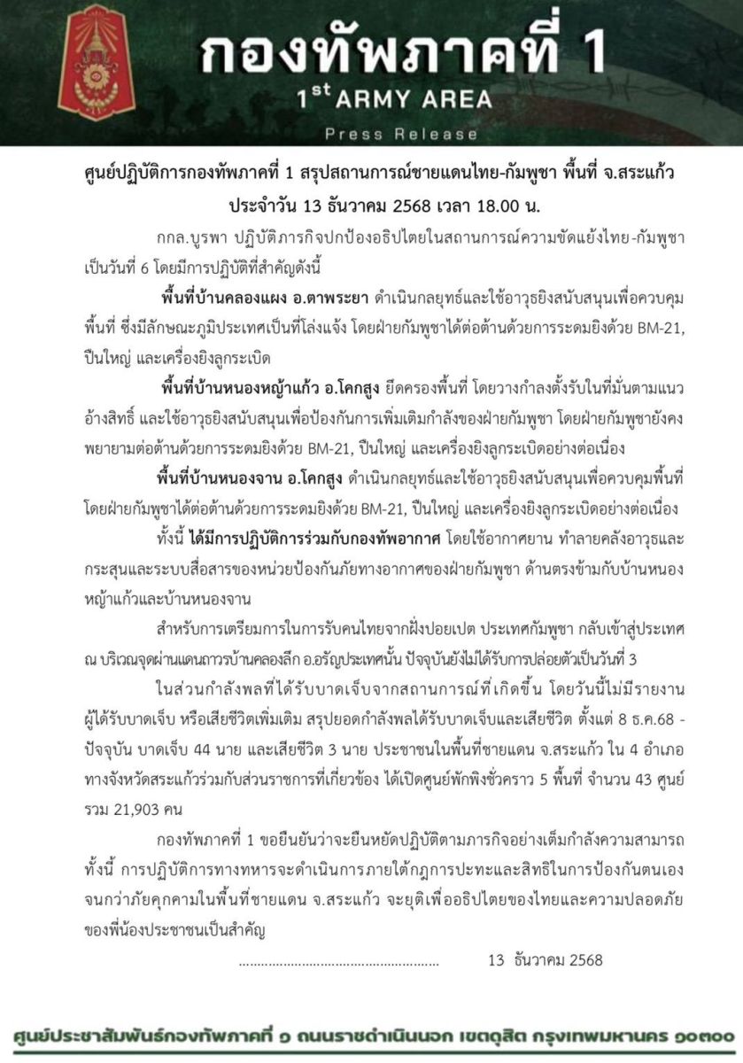 กองทัพภาคที่ 1 ขอยืนยันว่าจะยืนหยัดปฏิบัติตามภารกิจอย่างเต็มกำลังความสามารถ ทั้งนี้ การปฏิบัติการทางทหารจะดำเนินการภายใต้กฎการปะทะและสิทธิในการป้องกันตนเอง จนกว่าภัยคุกคามในพื้นที่ชายแดน จ.สระแก้ว จะยุติเพื่ออธิปไตยของไทยและความปลอดภัยของพี่น้องประชาชนเป็นสำคัญ