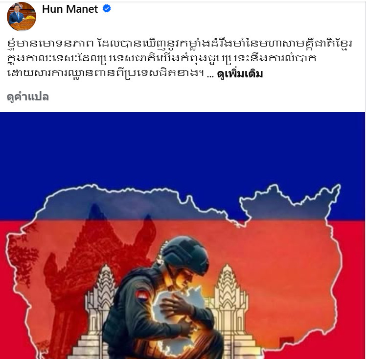 นายกรัฐมนตรีฮุน มาเนต ของกัมพูชาโพสต์เฟซบุ๊ก ระบุว่า “ตัวเองรู้สึกภาคภูมิใจที่ได้เห็นความเข้มแข็งของชาวกัมพูชา ในสถานการณ์ที่ประเทศของเรากำลังเผชิญกับความยากลำบาก เนื่องจากการรุกรานจากประเทศเพื่อนบ้าน
