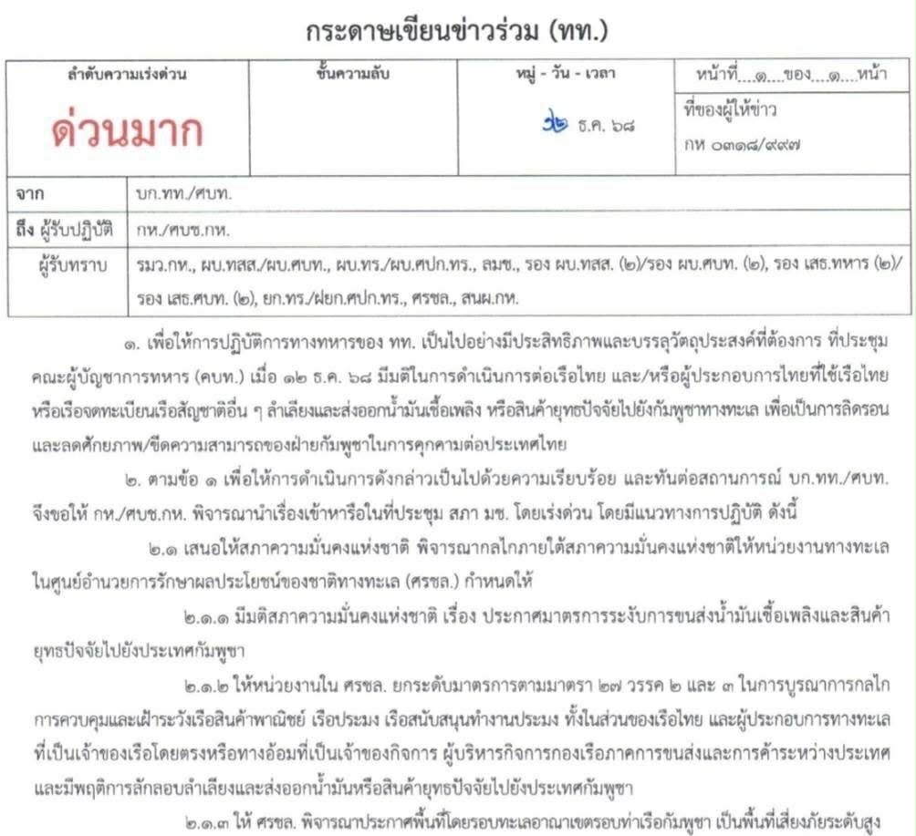 1.เพื่อให้การปฏิบัติการทางทหารของกองทัพไทย เป็นไปอย่างมีประสิทธิภาพและบรรลุวัตถุประสงค์ที่ต้องการ ที่ประชุมคณะผู้บัญชาการทหาร (คบท.) เมื่อ 12 ธ.ค.2568 มีมติในการดำเนินการต่อเรือไทย และ/หรือผู้ประกอบการไทยที่ใช้เรือไทยหรือเรือจดทะเบียนเรือสัญชาติอื่น ๆ ลำเลียงและส่งออกน้ำมันเชื้อเพลิง หรือสินค้ายุทธปัจจัยไปยังกัมพูชาทางทะเล เพื่อเป็นการลิดรอนและลดศักยภาพ ขีดความสามารถของฝ่ายกัมพูชาในการคุกคามต่อประเทศไทย