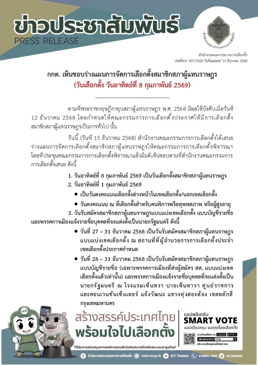 - วันอาทิตย์ที่ 8 กุมภาพันธ์ 2569 เป็นวันเลือกตั้งสมาชิกสภาผู้แทนราษฎร