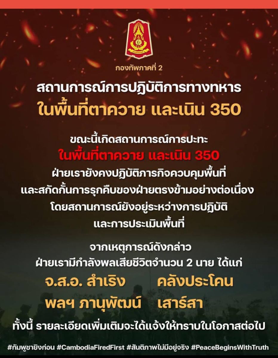 กองทัพภาคที่ 2 รายงานสถานการณ์การปฏิบัติการทางทหาร เกิดการปะทะในพื้นที่ตาควาย และเนิน 350 ว่า จากสถานการณ์การปฏิบัติการทางทหารในพื้นที่แนวรบปราสาทตาควาย–เนิน 350–เนิน 225 หน่วยทหารของฝ่ายเราได้เข้าควบคุมพื้นที่บริเวณ ตัวปราสาทตาควาย และดำเนินการสถาปนาความมั่นคงในพื้นที่โดยรอบอย่างต่อเนื่อง มีการจัดวางมาตรการป้องกันพื้นที่ตามหลักยุทธวิธีเพื่อเสริมความมั่นคงและความปลอดภัยของกำลังพล ขณะเดียวกัน พื้นที่เนิน 225 ฝ่ายเรายังคงตรึงกำลังเพื่อควบคุมเส้นทางยุทธศาสตร์สำคัญ