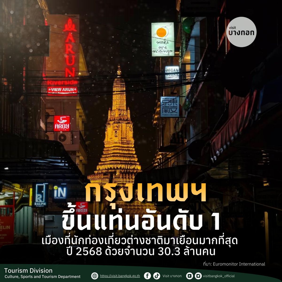 17 ธันวาคม 2568 เพจ กรุงเทพมหานคร โพสต์ข้อความ ระบุ ใครไม่มาถือว่าพลาด! จากข้อมูลล่าสุดของ “Euromonitor International” ในรายงาน Top 100 City Destinations Index 2025 ยืนยันแล้วว่าปีนี้ กทม. ฮอตปรอทแตก ต้อนรับนักท่องเที่ยวไป 30.3 ล้านคน ชนะเลิศอันดับ 1 ของโลกไปเลยจ้า