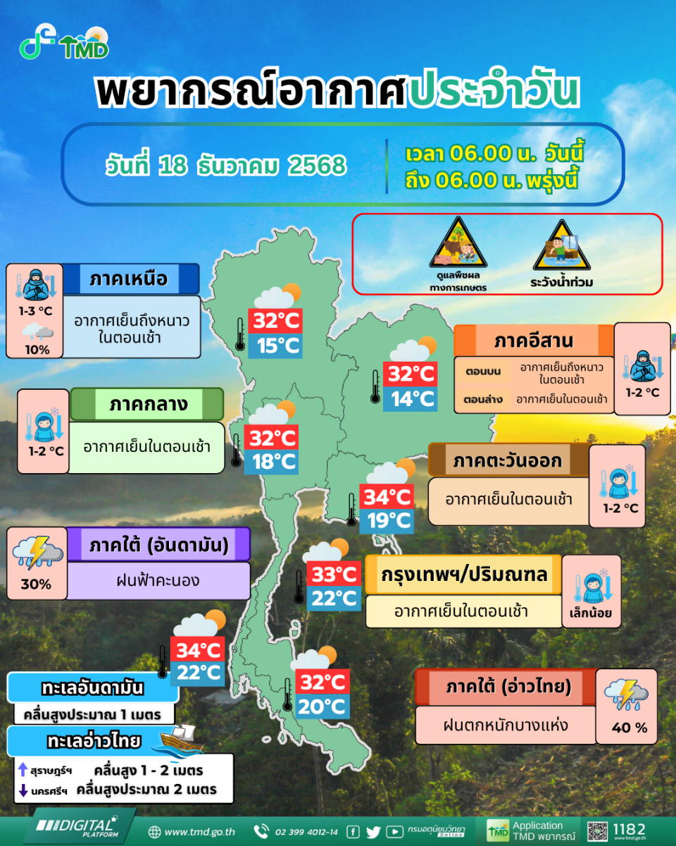 ลักษณะอากาศทั่วไป วันที่ 18 ธันวาคม 2568 พยากรณ์อากาศ 24 ชั่วโมงข้างหน้า ประเทศไทยตอนบนมีอากาศเย็นถึงหนาวในตอนเช้า และอุณหภูมิจะลดลง 1-3 องศาเซลซียส โดยมีฝนเกิดขึ้นได้บางพื้นที่ ในภาคเหนือตอนบนและภาคตะวันออกเฉียงเหนือตอนบน เนื่องจากบริเวณความกดอากาศสูงหรือมวลอากาศเย็นยังคงปกคลุมประเทศไทยตอนบน