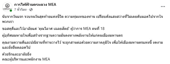 “นับจากวันแรก จวบจนวันสุดท้ายแห่งชีวิต ความทุ่มเทของท่าน เปรียบดั่งแสงสว่างที่ไม่เคยดับมอดไปจากใจพวกเรา ​ขอสดุดีและไว้อาลัยแด่ ‘คุณวิลาศ เฉลยสัตย์’ ผู้ว่าการ MEA คนที่ 18 ผู้อุทิศลมหายใจเพื่อสร้างรากฐานความมั่นคงทางพลังงานให้แก่คนเมืองมหานคร คุณงามความดีและปณิธานที่ท่านวางไว้ จะถูกสานต่อด้วยความภาคภูมิใจ เพื่อให้เมืองมหานครแห่งนี้ งดงามและยั่งยืนตลอดไป ​ด้วยรักและอาลัยยิ่ง”