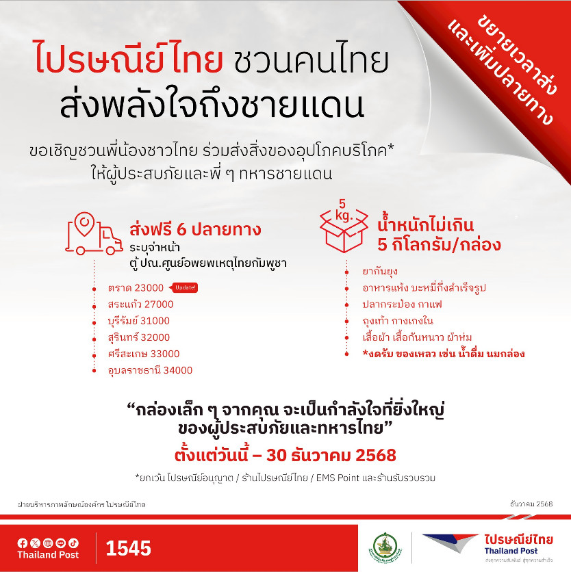 ดร.ดนันท์ สุภัทรพันธุ์ กรรมการผู้จัดการใหญ่ บริษัท ไปรษณีย์ไทย จำกัด กล่าวว่า จากสถานการณ์การปะทะพื้นที่ชายแดนไทย–กัมพูชาที่ยังต้องการการสนับสนุนอย่างต่อเนื่อง ไปรษณีย์ไทยจึงขยายระยะเวลา การเปิดรับฝากส่งสิ่งของอุปโภคบริโภคที่จำเป็น ผ่าน “ตู้ ปณ.ศูนย์อพยพเหตุไทย–กัมพูชา” โดยให้บริการฝากส่งฟรีจนถึงวันที่ 30 ธันวาคม 2568 พร้อมใช้ศักยภาพเครือข่ายไปรษณีย์ทั่วประเทศเป็นกลไกหลักในการลำเลียงสิ่งของ จากประชาชนไปยังพื้นที่ชายแดนได้อย่างปลอดภัย รวดเร็ว และเป็นระบบ ส่งตรงไปยังผู้อพยพและเจ้าหน้าที่ทหารที่ปฏิบัติหน้าที่ในพื้นที่ชายแดนไทย–กัมพูชาอย่างทันท่วงที
