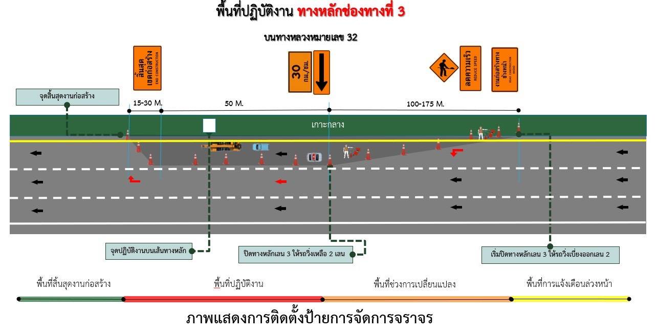 เบี่ยงการจราจรช่องทางหลัก 1 ช่องจราจร ขาเข้า ด้านชิดเกาะกลาง