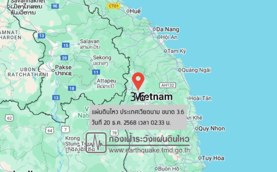 วันที่ 20 ธ.ค. 2568 เวลา 02.33 น. กองเฝ้าระวังแผ่นดินไหว กรมอุตุนิยมวิทยา แจ้งเหตุ แผ่นดินไหว ขนาด 3.6 ความลึก 3 กม. ภายในพื้นที่ของประเทศเวียดนาม (14.65°N,107.83°E) ศูนย์กลางห่างออกไปทางทิศตะวันออกเฉียงใต้ของ อ.เมือง จ.อุบลราชธานี ประมาณ 326 กม. ยังไม่มีรายงานผลกระทบต่อประเทศไทย