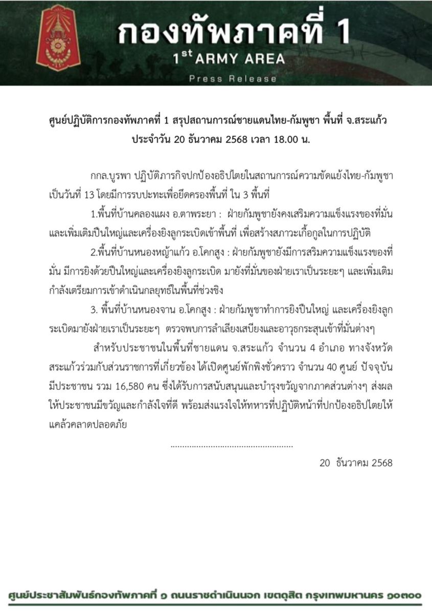 ศูนย์ปฏิบัติการกองทัพภาคที่ 1 สรุปสถานการณ์ชายแดนไทย-กัมพูชา พื้นที่ จ.สระแก้ว ประจำวัน 20 ธันวาคม 2568 เวลา 18.00 น.