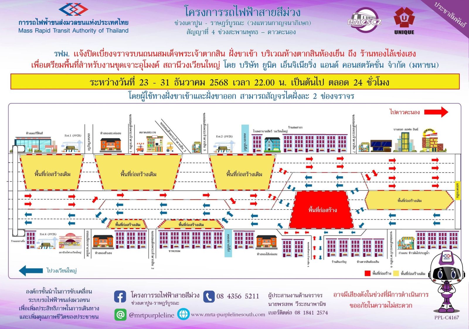 การรถไฟฟ้าขนส่งมวลชนแห่งประเทศไทย (รฟม.) แจ้งว่า บริษัท ยูนิค เอ็นจิเนียริ่ง แอนด์ คอนสตรัคชั่น จำกัด (มหาชน) ผู้รับจ้างงานออกแบบและก่อสร้างอุโมงค์ทางวิ่งและสถานีใต้ดิน โครงการรถไฟฟ้าสายสีม่วง ช่วงเตาปูน - ราษฎร์บูรณะ (วงแหวนกาญจนาภิเษก) สัญญาที่ 4 ช่วงสะพานพุทธ - ดาวคะนอง มีความจำเป็นต้องปิดเบี่ยงจราจรบนถนนสมเด็จพระเจ้าตากสิน ฝั่งขาเข้า บริเวณห้างตากสินห้องเย็น ถึง ห้างทองไล้เซ่งเฮง เพื่อเตรียมพื้นที่สำหรับงานขุดเจาะอุโมงค์ สถานีวงเวียนใหญ่ ระหว่างวันที่ 23 - 31 ธันวาคม 2568 เวลา 22.00 น. เป็นต้นไป ตลอด 24 ชั่วโมง โดยผู้ใช้ทางฝั่งขาเข้าและฝั่งขาออกสามารถสัญจรได้ฝั่งละ 2 ช่องจราจร