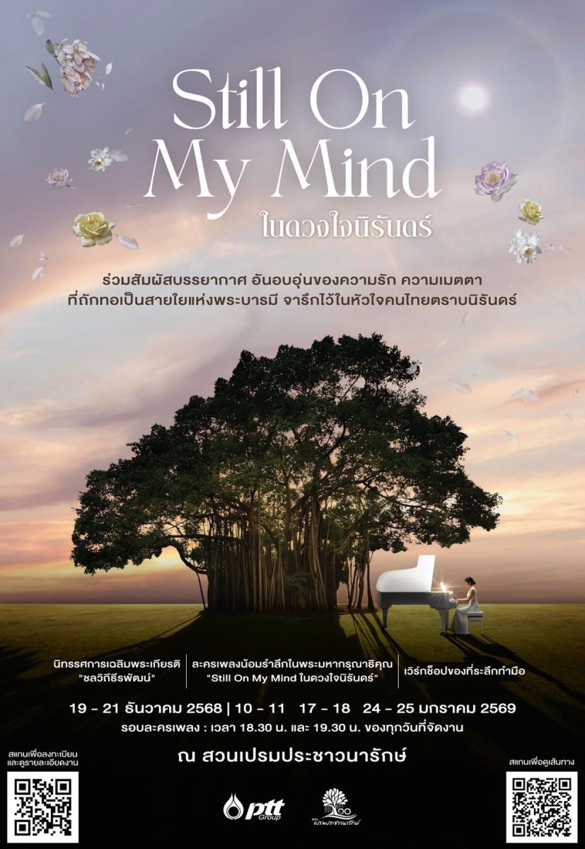 วานนี้ (20 ธ.ค. 2568) – ดร.คงกระพัน อินทรแจ้ง ประธานเจ้าหน้าที่บริหารและกรรมการผู้จัดการใหญ่ บริษัท ปตท. จำกัด (มหาชน) (ปตท.) พร้อมด้วย คณะผู้บริหารกลุ่ม ปตท. ร่วมเปิดงาน “Still On My Mind ในดวงใจนิรันดร์” เพื่อน้อมรำลึกในพระมหากรุณาธิคุณสมเด็จพระนางเจ้าสิริกิติ์ พระบรมราชินีนาถ พระบรมราชชนนีพันปีหลวง จัดขึ้นในวันที่ 19 – 21 ธันวาคม 2568 และต่อเนื่องในช่วงต้นปีใหม่ ระหว่างวันที่ 10 – 11, 17 – 18 และ 24 - 25 มกราคม 2569 เปิดให้ประชาชนเข้าชม โดยไม่เสียค่าใช้จ่าย ตั้งแต่เวลา 16.00 – 21.00 น. ณ สวนเปรมประชาวนารักษ์ เขตหลักสี่ กรุงเทพมหานคร