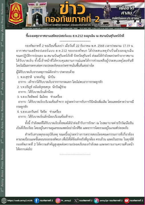 กองทัพภาคที่ 2 ขอเรียนชี้แจงว่า เมื่อวันที่ 22 ธันวาคม พ.ศ. 2568 เวลาประมาณ 17.19 น. อากาศยานเฮลิคอปเตอร์แบบ ฮ.ท.212 ของกองทัพบก ได้ประสบเหตุจำเป็นต้องลงฉุกเฉิน ขณะปฏิบัติการร่อนลง ณ สนามบินสุรินทร์ภักดี จังหวัดสุรินทร์ ส่งผลให้กำลังพลประจำอากาศยาน ได้รับบาดเจ็บ ทั้งนี้เจ้าหน้าที่ได้ควบคุมสถานการณ์และให้การช่วยเหลือผู้ประสบเหตุโดยทันที โดยไม่มีผลกระทบต่อความปลอดภัยของประชาชนในพื้นที่แต่อย่างใด