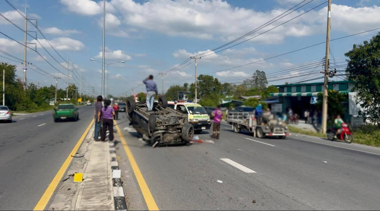 รถกระบะชนกับรถจักรยานยนต์ ก่อนจะพลิกงหงายท้อง กลางถนนหมายเลข 333 มีผู้บาดเจ็บหลายราย และพบร่างผู้เสียชีวิตติดค้างในซากรถ จ.สุพรรณบุรี