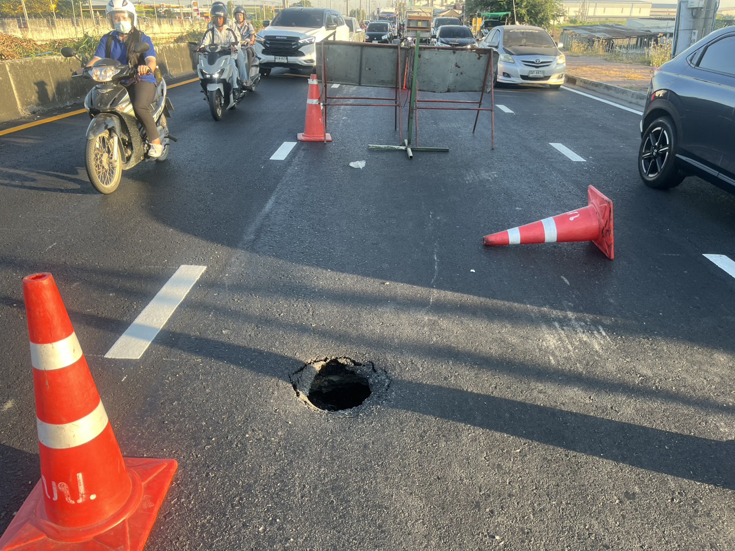 08.41 น. ถนนตำหรุ-บางพลี มุ่งหน้าสุขุมวิท ก่อนถึงแยกคลองเก้า (ตัดกับถนนแพรกษา) ประมาณ 500 เมตร พื้นถนนชำรุดเป็นหลุม ในช่องทางกลาง อยู่ระหว่างแก้ไข ตามหลังมาโปรดระวัง #รายงนจราจร #รถติด #FM91