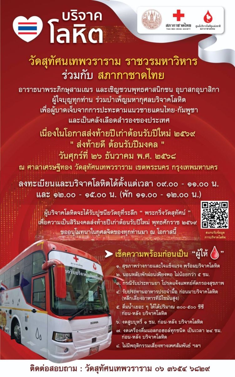 วัดสุทัศนเทพวราราม ราชวรมหาวิหาร ร่วมกับสภากาชาดไทย ขอเชิญชวนพระภิกษุสามเณร และพุทธศาสนิกชน อุบาสก อุบาสิกา ตลอดจนประชาชนผู้มีจิตศรัทธา ร่วมบำเพ็ญมหากุศลด้วยการ บริจาคโลหิต เพื่อช่วยเหลือผู้บาดเจ็บจากเหตุปะทะตามแนวชายแดนไทย–กัมพูชา และเพื่อเป็นคลังเลือดสำรองของประเทศ