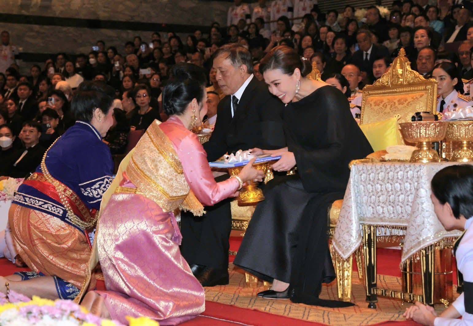 จากนั้น เสด็จ ฯ ไปยังหอประชุมใหญ่ พระราชทานพระบรมราชวโรกาสให้ นายประสพ เรียงเงิน ปลัดกระทรวงวัฒนธรรม เข้าเฝ้า ฯ ทูลเกล้า ฯ ถวายสูจิบัตร นางยุถิกา อิศรางกูร ณ อยุธยา อธิบดีกรมส่งเสริมวัฒนธรรม เข้าเฝ้า ฯ ทูลเกล้า ฯ ถวายสูจิบัตร แด่สมเด็จพระนางเจ้า ฯ พระบรมราชินี ศาสตราจารย์เกียรติคุณชริตา รักษ์พลเมือง เข้าเฝ้า ฯ ทูลเกล้า ฯ ถวายหนังสือที่ระลึก แด่พระบาทสมเด็จพระเจ้าอยู่หัว ผู้ช่วยศาสตราจารย์บัวรอง ลิ่วเฉลิมวงศ์ เข้าเฝ้า ฯ ทูลเกล้า ฯ ถวายของที่ระลึกแด่สมเด็จพระนางเจ้า ฯ พระบรมราชินี และนางเบญจวรรณ สร่างนิทร ประธานคณะกรรมการอำนวยการจัดการแสดง และกรรมการมูลนิธิสมาคมสตรีอุดมศึกษา แห่งประเทศไทย ในพระอุปถัมภ์ของ สมเด็จพระเจ้าพี่นางเธอ เจ้าฟ้ากัลยาณิวัฒนา กรมหลวงนราธิวาสราชนครินทร์ กราบบังคมทูลรายงานวัตถุประสงค์ของการจัดงาน ฯ พร้อมทั้งกราบบังคมทูลเชิญ ทอดพระเนตรการแสดงรำถวายอาลัย สมเด็จพระนางเจ้าสิริกิติ์ พระบรมราชินีนาถ พระบรมราชชนนีพันปีหลวง "ยี่สิบสี่ตุลา มหาวิปโยค" รำถวายพระพร และการแสดงละครเสภา เรื่อง "ขุนช้าง - ขุนแผน" ตอน พลายชุมพล ตามลำดับ